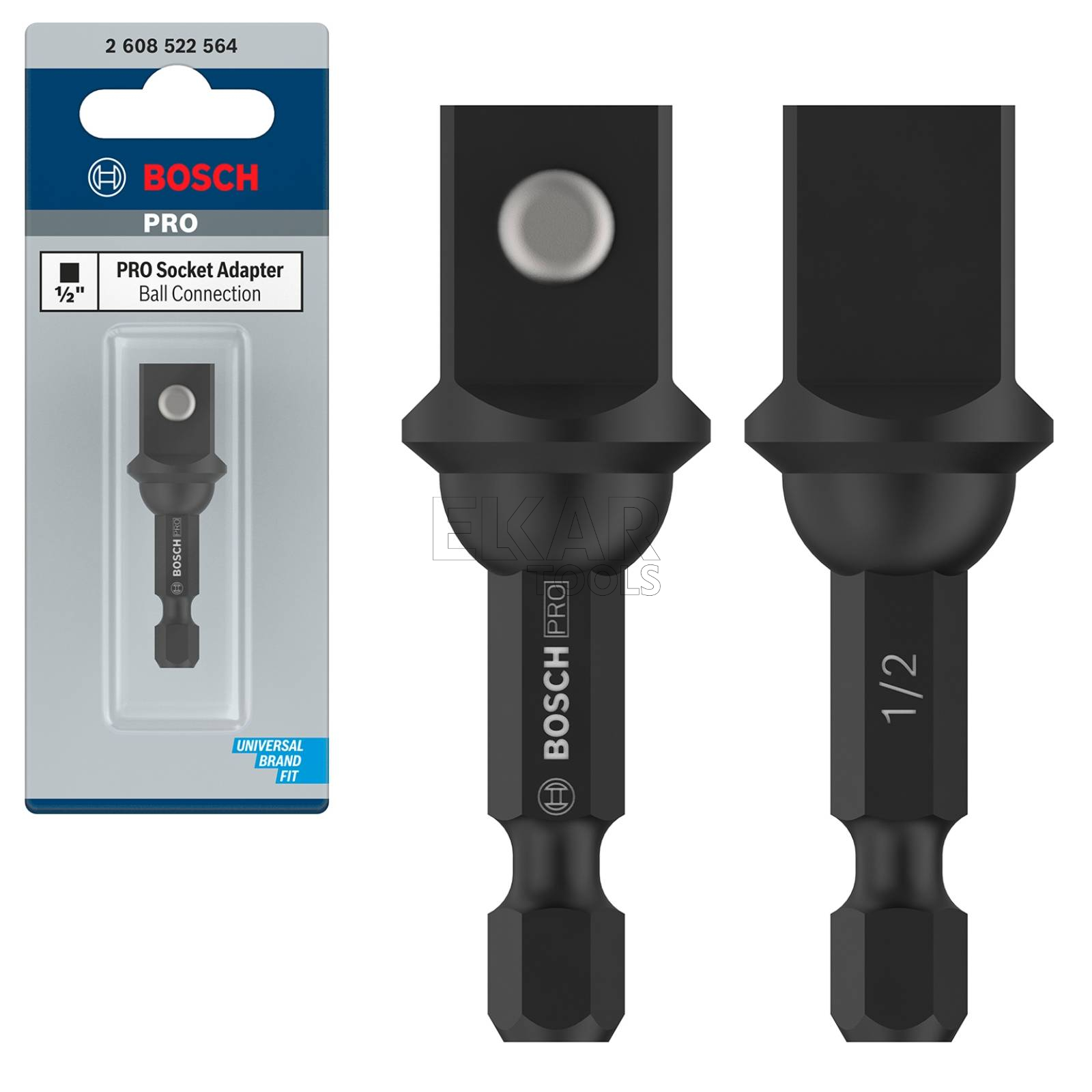 Adapter ze złączem kulowym BOSCH 2608522564 o długości 50 mm to praktyczne akcesorium umożliwiające szybkie i bezpieczne połączenie narzędzi z końcówką 1/2” z osprzętem 1/4” HEX. Dzięki zastosowaniu solidnego złącza kulowego, adapter zapewnia pewne trzymanie bitów oraz płynną i stabilną pracę, nawet przy dużym obciążeniu. Jest idealnym rozwiązaniem dla profesjonalistów i majsterkowiczów, którzy korzystają z różnego rodzaju narzędzi i potrzebują szybkiego przejścia między rozmiarami mocowań. PRO Socket Adapter umożliwia dokręcanie i usuwanie elementów złącznych, takich jak śruby i nakrętki, za pomocą wiertarko-wkrętarki i wkrętarki udarowej. Czworokątne gniazdo pasuje do kwadratowych nasadek. Czworokątne gniazdo ma złącze kulowe lub sworzniowe, co ułatwia podłączanie i wyjmowanie nasadek. Nadaje się tylko do zastosowań z momentem poniżej 80 Nm. Do cięższych zastosowań, takich jak wymiana kół, zalecamy stosowanie nasadek bezpośrednio z kluczem udarowym.