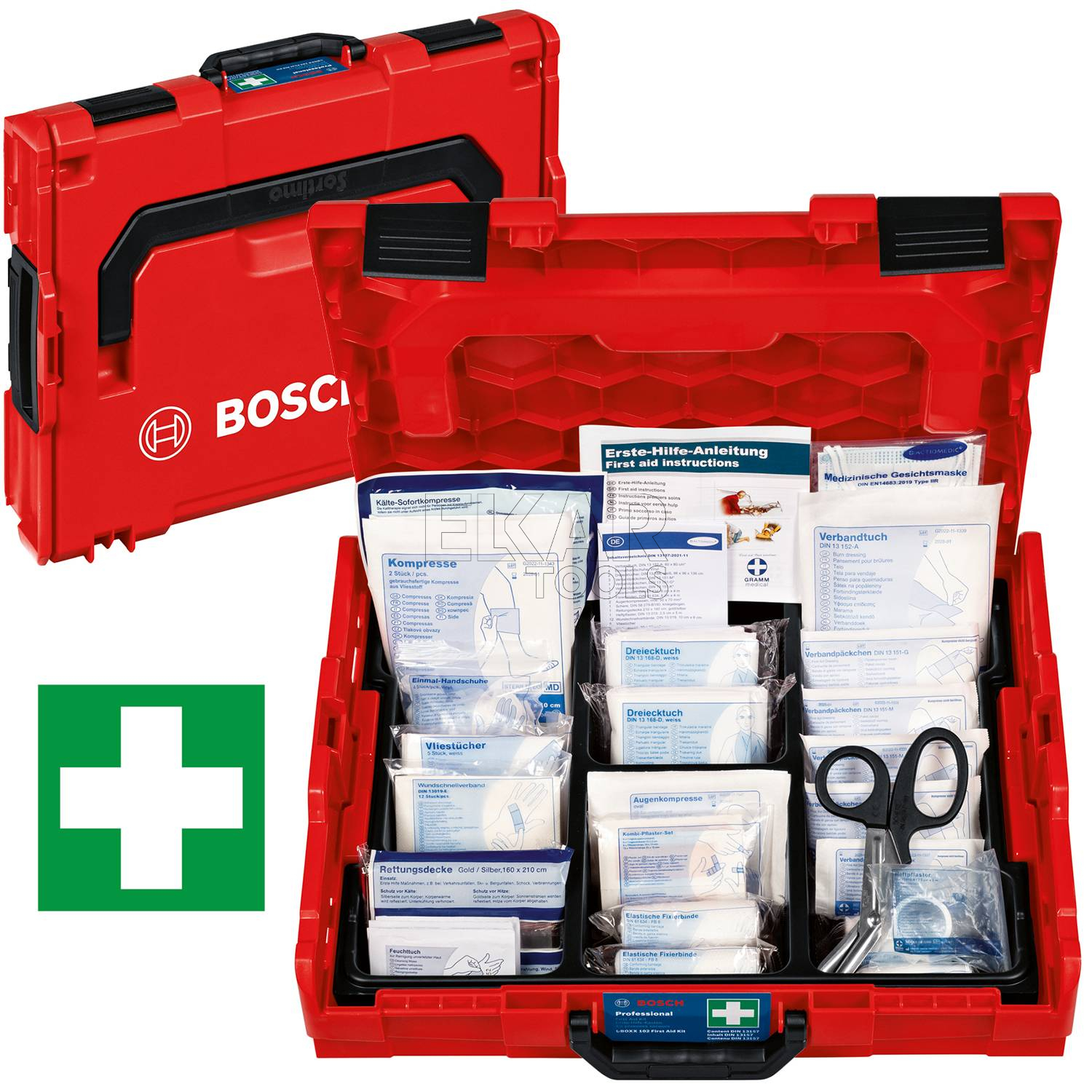 Jako profesjonalista, masz świadomość, że wypadki się zdarzają. Wiesz także, że gdy dojdzie do wypadku, musisz mieć pod ręką odpowiednio wyposażoną apteczkę. Możemy Ci w tym pomóc: Apteczka Bosch Professional jest zgodna z normą DIN 13157 i dostępna w walizce L-BOXX 102, która jest częścią systemu Bosch Mobility. Zapewnia Ci to pełną elastyczność działania, ponieważ apteczka będzie kompatybilna z innymi wariantami walizek L-BOXX. Bezpieczne zamknięcie na zatrzaski i wytrzymały materiał to kluczowe elementy konstrukcji walizek L-BOXX; dodatkowa rękojeść z przodu ułatwia przenoszenie walizki blisko ciała. Walizka L-BOXX z apteczką ma kolor czerwony. W sytuacji awaryjnej szybko ją znajdziesz wśród innych walizek L-BOXX, które mają kolor niebieski. Zamocuj apteczkę z wierzchu innej walizki L-BOXX i miej ją przy sobie – wraz z resztą sprzętu – podczas wykonywania prac na budowie.
