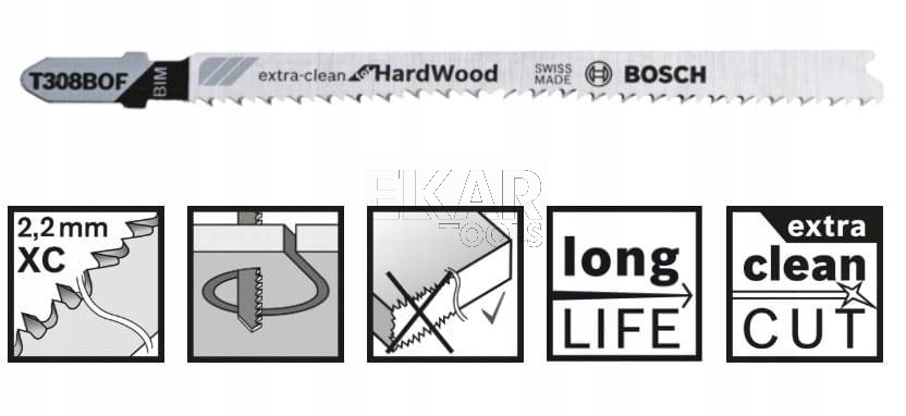 Brzeszczot T 308 BOF Extra-Clean for Hard Wood do wyrzynarki umożliwia bardzo czyste krzywolinijne cięcia w drewnie. Precyzyjnie oszlifowane zęby ze stożkowo szlifowanym grzbietem umożliwiają uzyskanie czystego cięcia. Ponadto wąski brzeszczot umożliwia krzywoliniowe cięcia z małym promieniem. Dzięki dwóm rzędom zębów umieszczonym pod różnymi kątami można ciąć bez strzępienia górnej, jak i dolnej powierzchni. Wykonane z bimetalu i hartowanej stali szybkotnącej (HSS) uzębienie jest spojone z grzbietem z bardzo sprężystej stali wysokowęglowej (HCS), co umożliwia cięcie twardych materiałów, takich jak twarde drewno i ścierne mat. drewniane. Brzeszczot dzięki geometrii zębów 2.2XC, drobnej (2,2 mm) podziałce uzębienia i długiemu ostrzu (117 mm) może ciąć materiały drewniane o grubości 5–50 mm. Do stosowania z wyrzynarkami z uchwytem T.