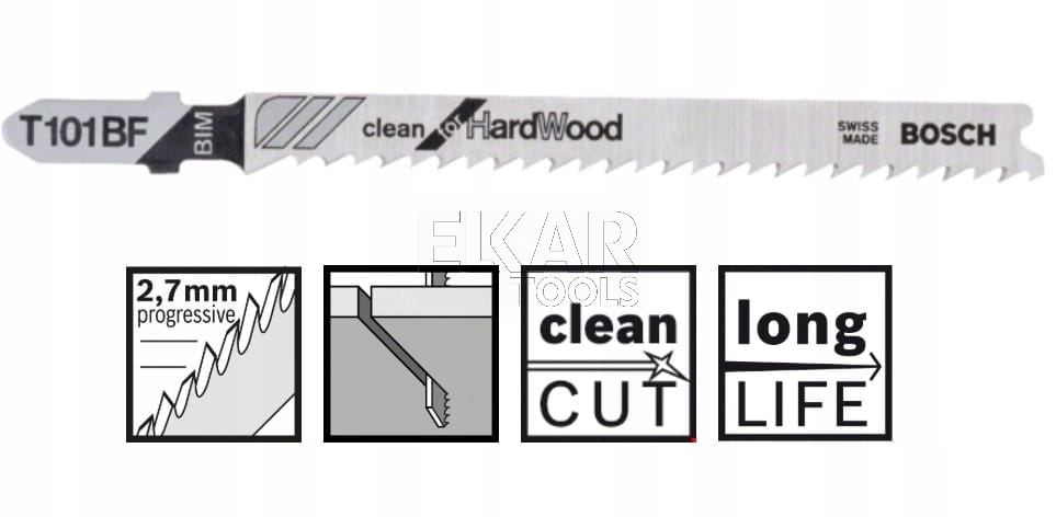 Brzeszczot T 101 BF Clean for Hard Wood do wyrzynarki umożliwia czyste proste cięcia w drewnie. Precyzyjnie oszlifowane zęby ze stożkowo szlifowanym grzbietem umożliwiają uzyskanie czystego cięcia. Wykonane z bimetalu i hartowanej stali szybkotnącej (HSS) uzębienie jest spojone z grzbietem z bardzo sprężystej stali wysokowęglowej (HCS), co umożliwia cięcie twardych materiałów, takich jak twarde drewno i ścierne materiały drewniane. Ostrze ma drobną (2,7 mm), stopniowaną podziałkę uzębienia i umożliwia cięcie różnych materiałów drewnianych o grubości 3–30 mm. Do stosowania z wyrzynarkami z uchwytem T.