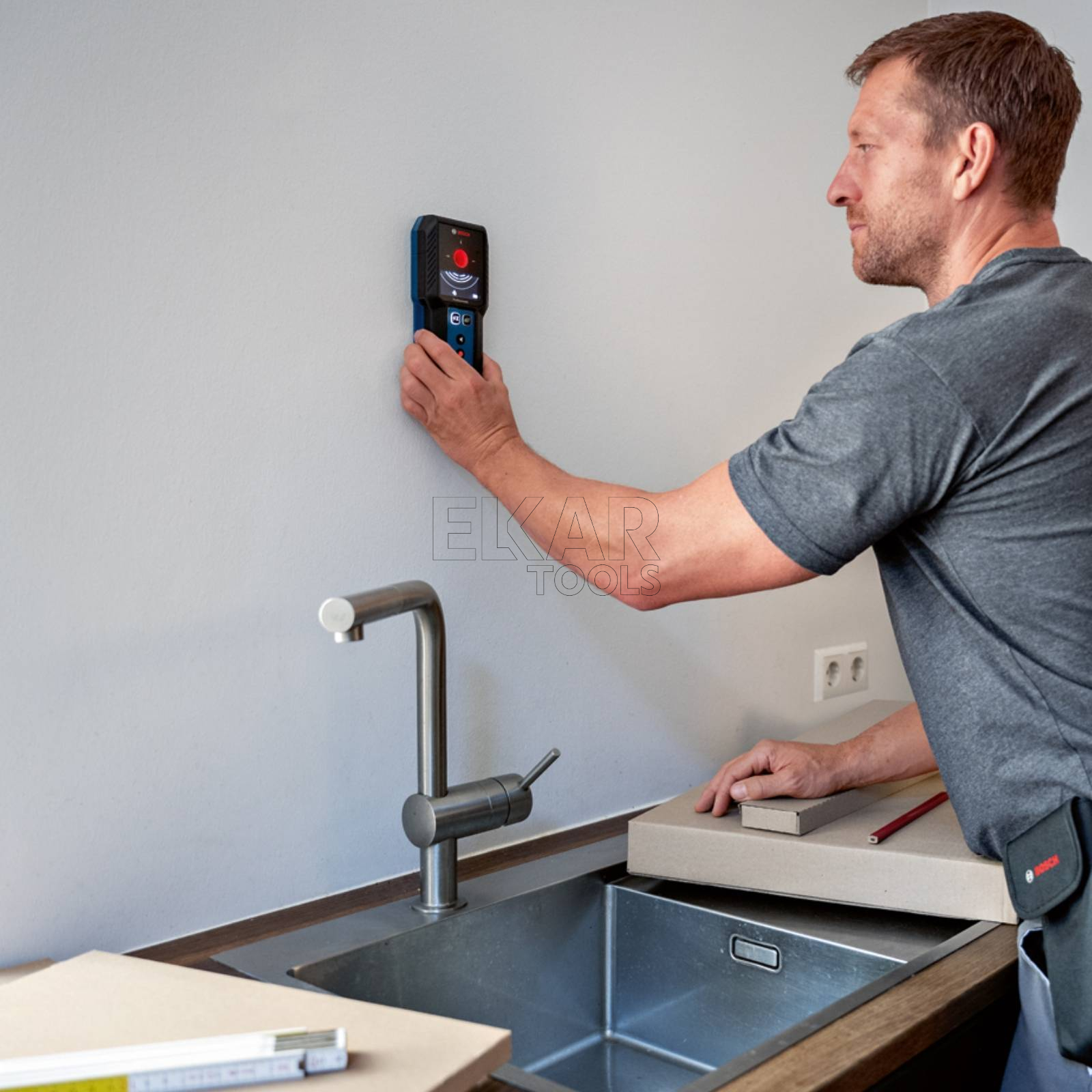 Nasz detektor GMS 120-27 Professional pomaga wykrywać i lokalizować metale, przewody pod napięciem i konstrukcje drewniane w ścianach gipsowo-kartonowych. Lokalizowanie obiektów w ścianach przed rozpoczęciem wiercenia zapewnia większe bezpieczeństwo pracy, szczególnie użytkownikom wykonującym prace remontowe i czynności takie jak montaż szaf, blatów kuchennych, umywalek, kotłów i systemów grzewczych lub instalacja klimatyzacji i systemów tryskaczowych. Detektor nie tylko umożliwia wskazanie środka wykrytego obiektu, lecz także informuje o właściwościach materiału, np. czy obiekt jest wykonany z metalu magnetycznego czy niemagnetycznego, czy jest przewodem pod napięciem czy też może obiektem niemetalowym.
