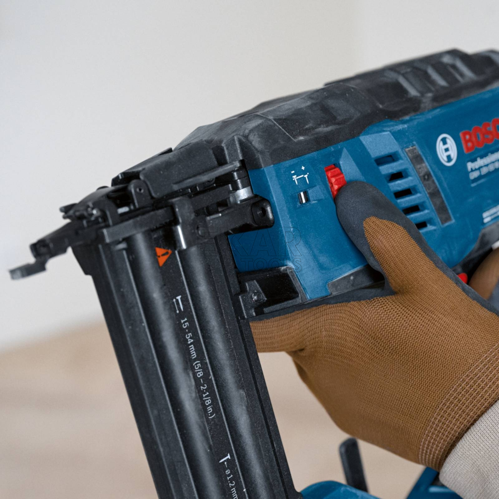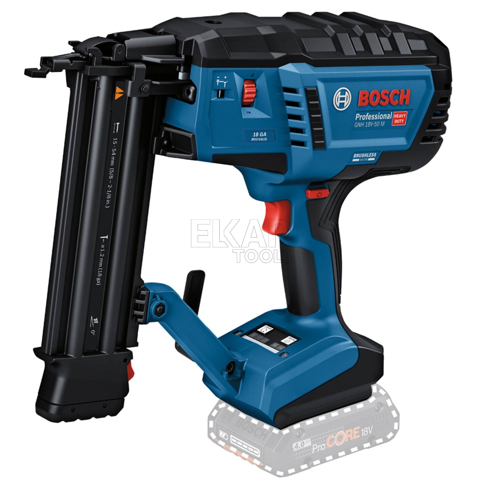 Bezszczotkowy model GNH 18V-50 M Professional to gwożdziarka do drewna o minimalnym odrzucie, dzięki czemu nie powoduje nadwyrężania nadgarstka. Konstrukcja umożliwia także włączanie i obsługę elektronarzędzia przy użyciu jednej ręki. To elektronarzędzie zapewnia pełną moc gwoździarki pneumatycznej, a przy tym nie wymaga użycia kompresora, nabojów gazowych ani przewodu zasilania. Idealne narzędzie do mocowania obudów okien i drzwi, listew dekoracyjnych lub wykończeniowych, listew przyszybowych, listew przypodłogowych, do montażu mebli lub elementów zabudowy, a także do instalowania mocowanych na pióro i wpust paneli sufitowych i podłogowych.