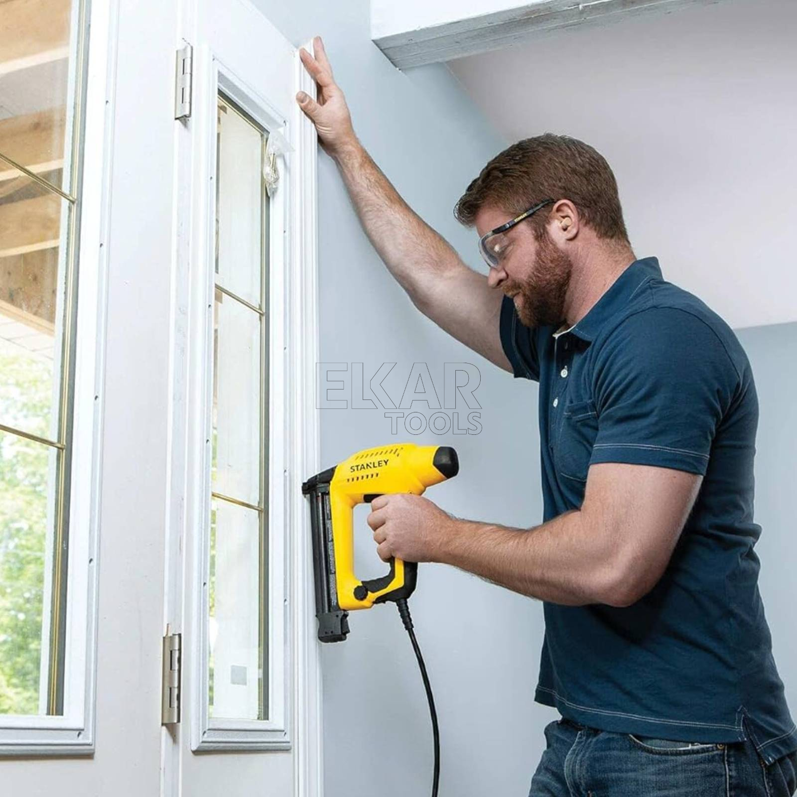 Gwoździarka elektryczna STANLEY 6-TRE650 to wszechstronne narzędzie idealne do montażu listew, paneli, ram i ościeżnic. Obsługuje gwoździe typu J o długości od 15 do 32 mm, zapewniając uniwersalność zastosowań. Ergonomiczny, miękki uchwyt zwiększa komfort pracy, a końcówka z ochroną przed uszkodzeniem powierzchni chroni materiały przed zarysowaniami. Długi przewód o długości 2,4 m zapewnia swobodę ruchu podczas pracy.