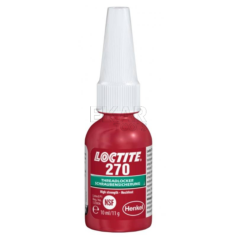 LOCTITE® 270 to trudno demontowalny produkt do zabezpieczania połączeń gwintowych, który zapobiega luzowaniu się części poddawanym drganiom, takim jak śruby mocujące, nakrętki lub kołki. Doskonały do trwałego zabezpieczania stałych połączeń, które nie mogą się luzować. Działa na wszystkich metalach, również na substratach pasywnych (np. stali nierdzewnej, aluminium i powierzchniach platerowanych). Cechuje się tolerancją na lekkie zanieczyszczenie olejami przemysłowymi, np. olejami silnikowymi, olejami zapobiegającymi korozji i chłodziwami. Możliwy demontaż po podgrzaniu do 300°C.