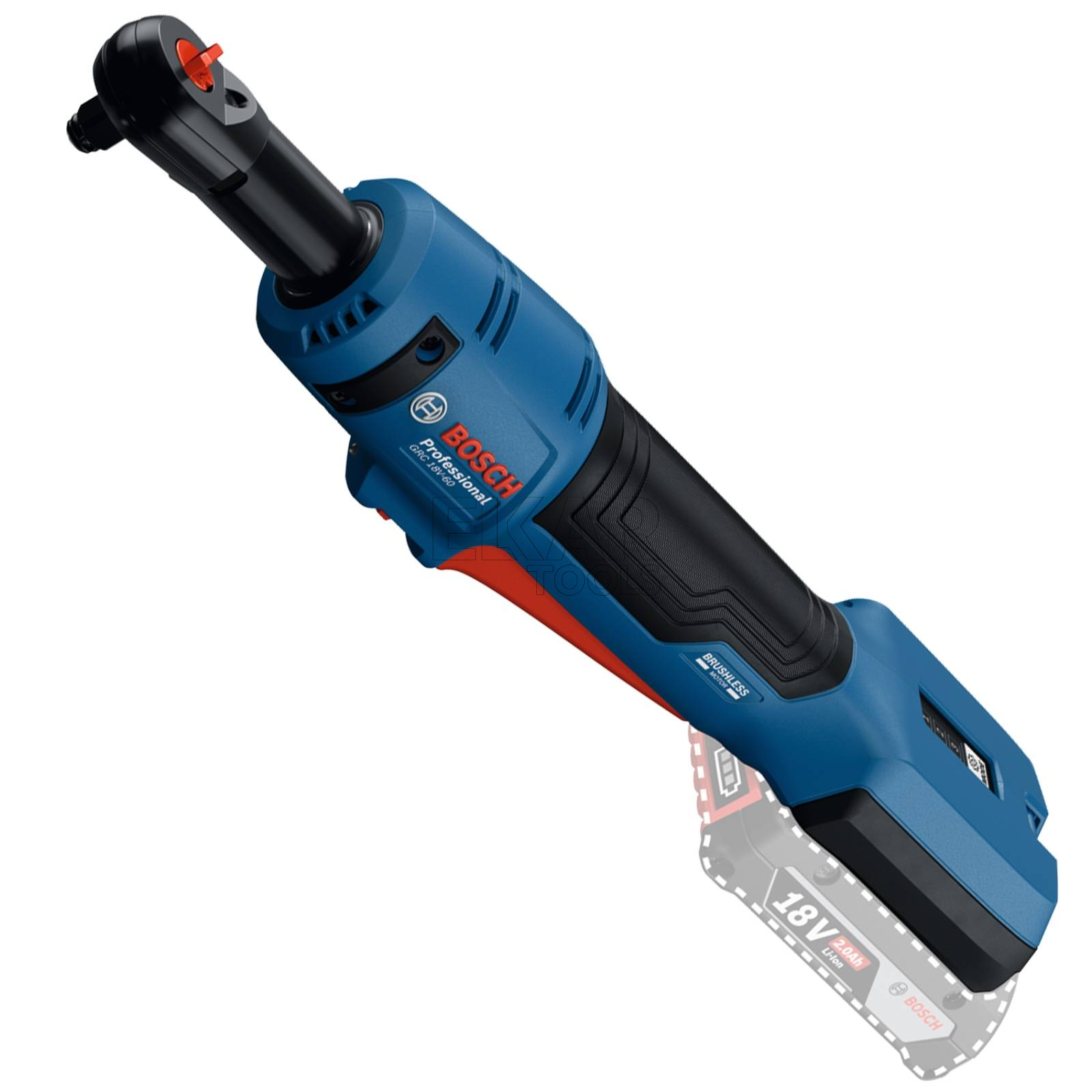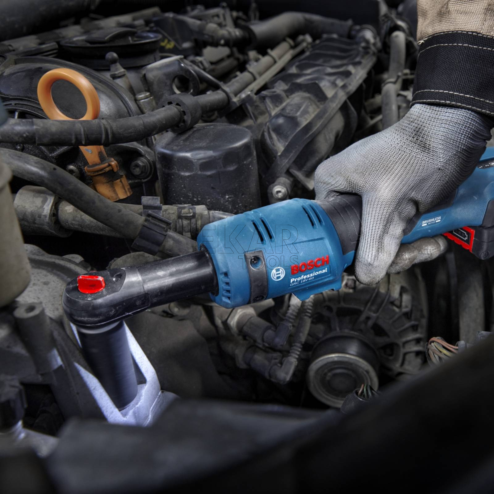 Akumulatorowy klucz grzechotkowy Bosch GRC 18V-60 jest wyposażony w wydajny silnik bezszczotkowy, który zapewnia wysoką prędkość obrotową i wysoki moment obrotowy. Funkcja HMI oferuje wybór różnych trybów dla prędkości obrotowej. Narzędzie ma długą szyjkę, która umożliwia pracę w miejscach trudno dostępnych, diodę LED, która oświetla miejsce pracy, oraz przycisk blokady zapobiegający przypadkowej aktywacji narzędzia. Jest także wyposażone w system elektronicznej ochrony ogniw ECP (Electronic Cell Protection), który wyłącza elektronarzędzie w przypadku przegrzania akumulatora.