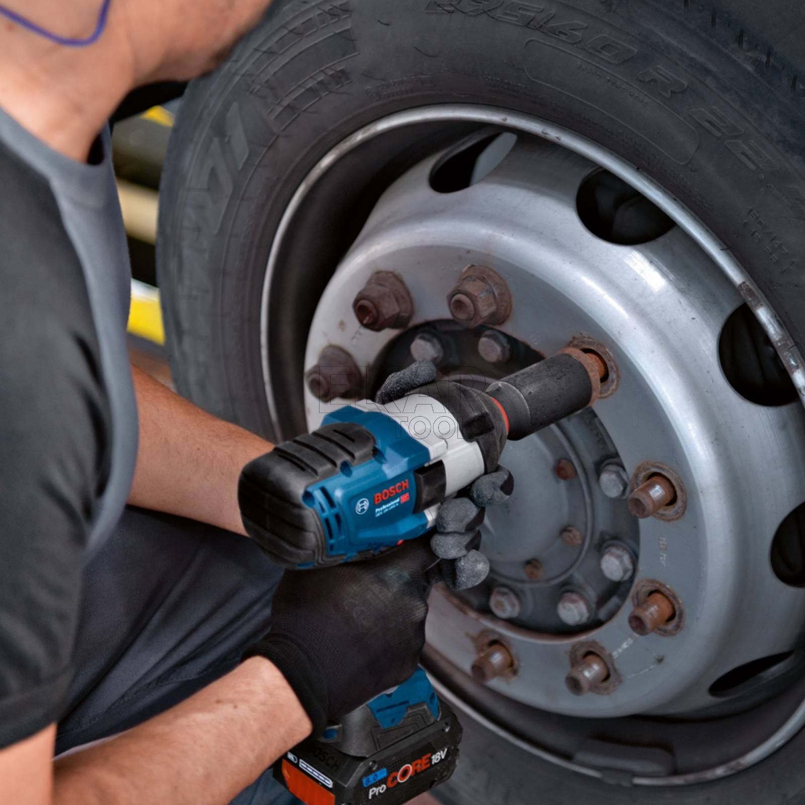 Klucz udarowy GDS 18V-1050 H z solidnym uchwytem 3/4", pierścieniem zabezpieczającym i otworem przelotowym zapewnia ekstremalna moc, którą można poczuć w trudnych zastosowaniach. Silnik bezszczotkowy o wysokiej wydajności w pełni wykorzystuje potencjał akumulatorów ProCORE 18V. Tam gdzie potrzebna jest wysoka wydajność heavy-duty, tam sprawdzi się nowy klucz z momentem dokręcającym do 1.050 Nm i momentem zrywającym 1.700 Nm. Trzy ustawienia prędkości zapewniają doskonałą kontrolę nad prędkością / momentem obrotowym, zapewniając dużą wszechstronność. Model GDS 18V-1050 H Professional jest przewidziany głównie do zastosowań w metalu (M10–M24), np. konstrukcje stalowe, montaż elementów metalowych, układanie rur, serwis samochodów ciężarowych i konstrukcje drewniane. Produkt jest kompatybilny ze wszystkimi akumulatorami i ładowarkami profesjonalnymi Bosch 18 V