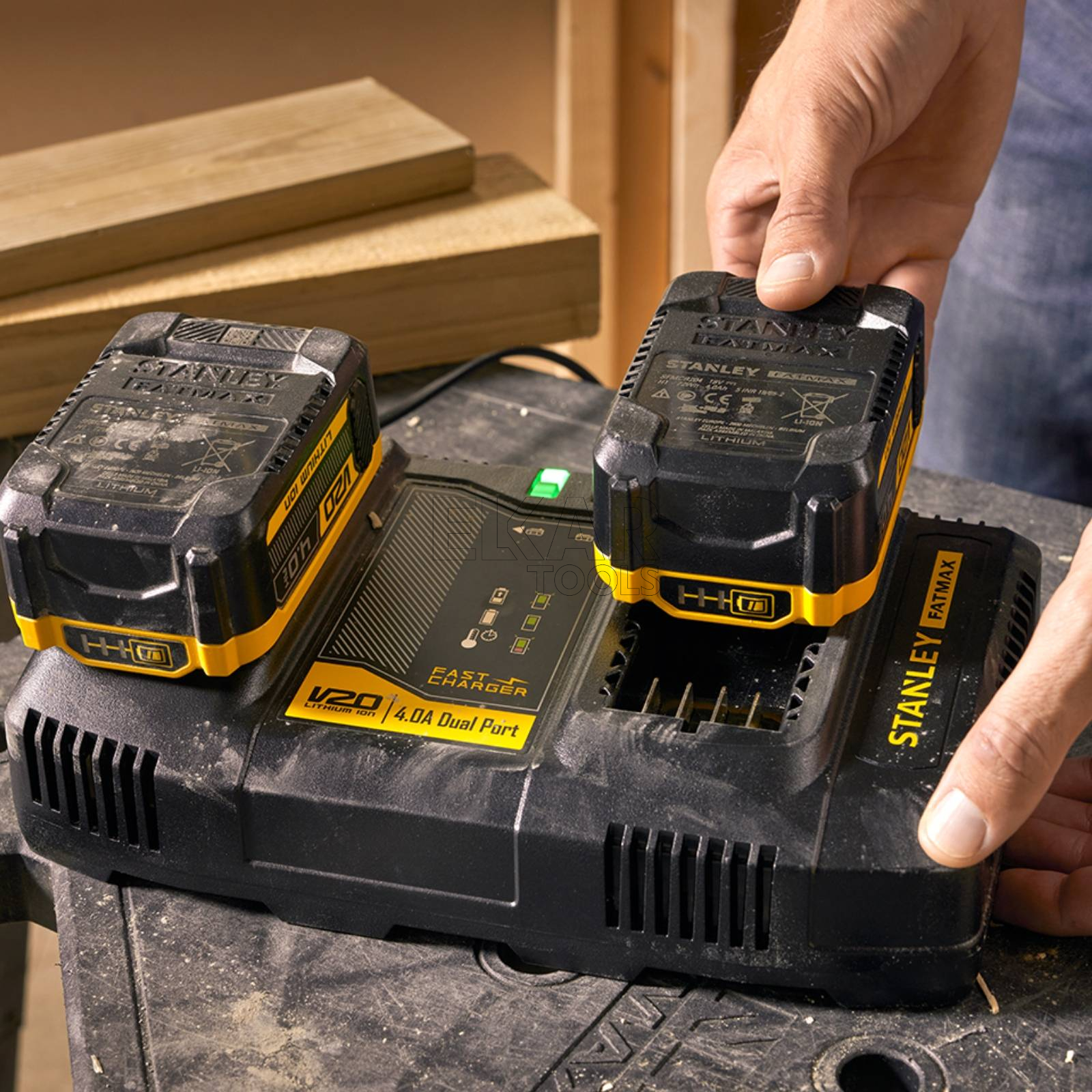 Ładowarka STANLEY SFMCB24 V20 to praktyczne urządzenie umożliwiające jednoczesne ładowanie dwóch akumulatorów systemu Stanley FATMAX V20 z maksymalnym prądem ładowania 4A, co znacząco skraca czas oczekiwania na pełne naładowanie. Dodatkowym atutem jest wbudowany port USB, który pozwala na wygodne ładowanie urządzeń mobilnych, takich jak smartfony czy tablety, bez potrzeby korzystania z osobnej ładowarki. Inteligentny system monitorowania kontroluje przebieg procesu ładowania, chroniąc akumulatory przed przegrzaniem, przeciążeniem i nadmiernym rozładowaniem, co wydłuża ich żywotność i gwarantuje bezpieczeństwo użytkowania.