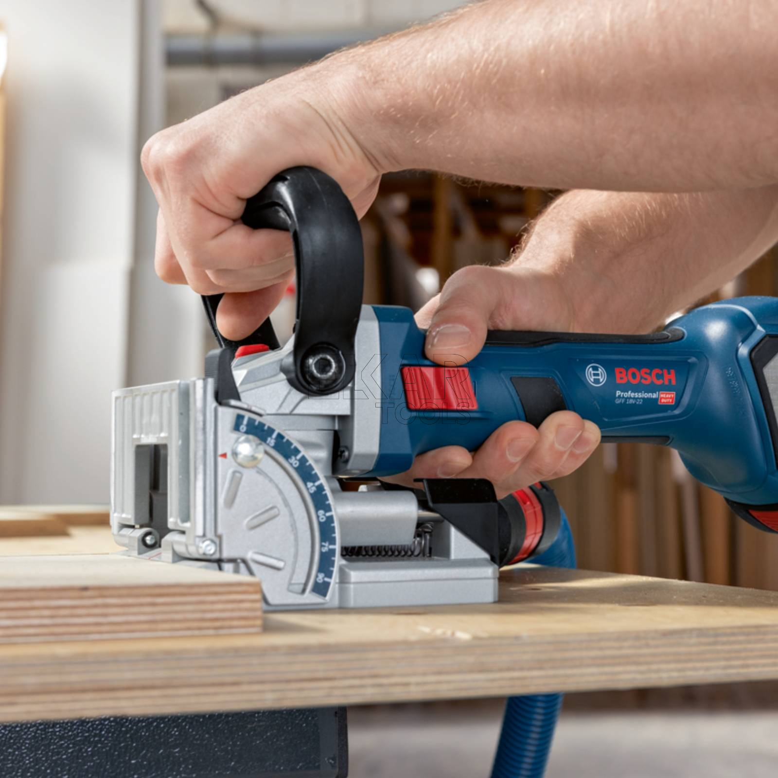 Twoja mobilność jest ograniczona, gdy używasz lamelownicy sieciowej do frezowania szczelin. To powoduje dyskomfort. Dzięki naszemu modelowi akumulatorowemu GFF 18V-22 Professional z workiem na pył masz zapewnioną nie tylko maksymalną swobodę pracy, ale także większą precyzję. Narzędzie umożliwia poruszanie się wokół stołów roboczych bez żadnych ograniczeń podczas wykonywania złączy w elementach drewnianych. Możesz zatem liczyć na profesjonalny rezultat pracy i komfort, który zapewniają wytrzymałe przykładnice kątowe wykonane z aluminium, funkcja płynnego zagłębiania frezu w materiale oraz wiele innych funkcji i ustawień. Korzystaj z płynnej regulacji głębokości, wysokości i kąta pracy bez dodatkowych narzędzi. Do dyspozycji masz wyraźne oznaczenia, które wskazują poziomą i pionową pozycję frezowania.