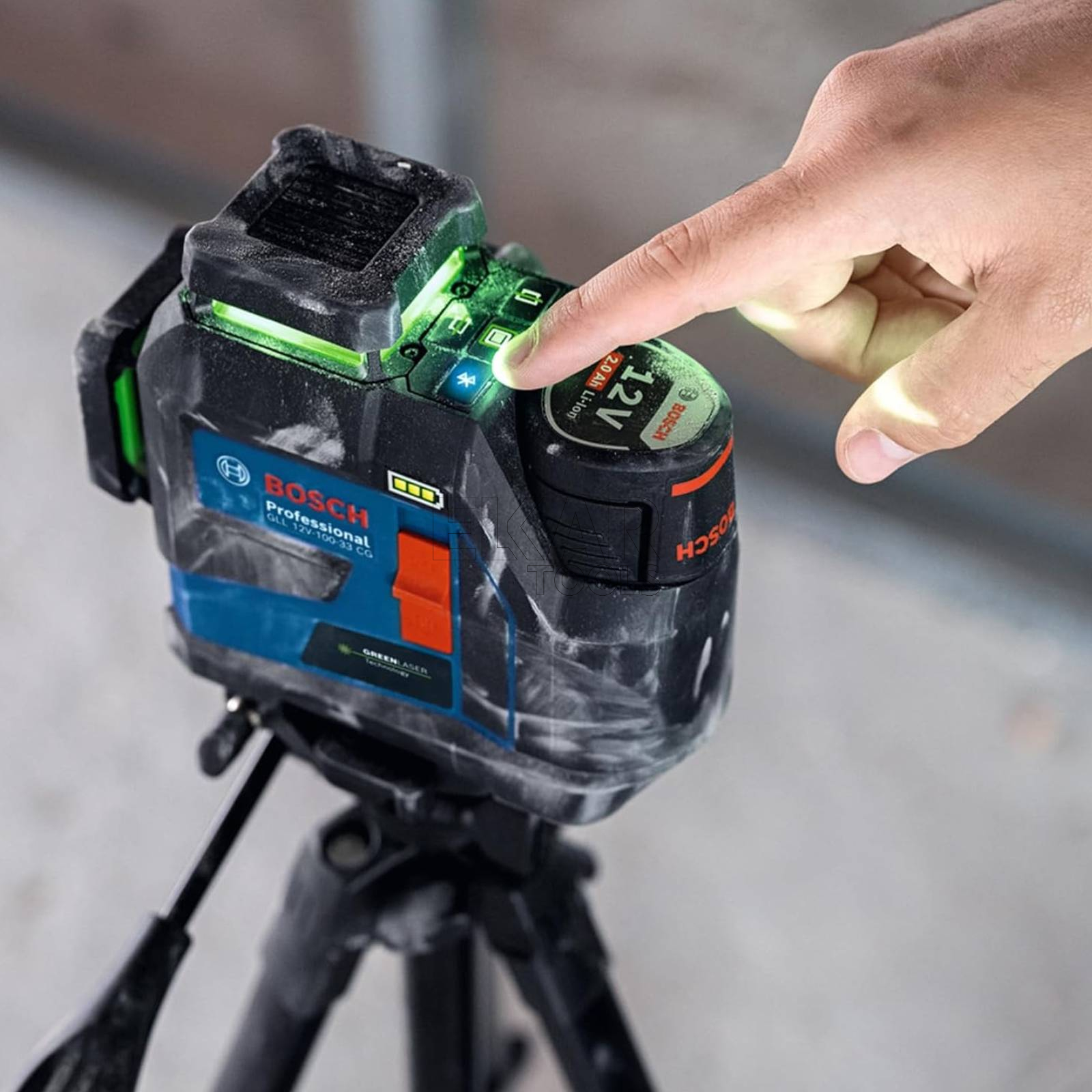 GLL 12V-100-33 CG Professional to wytrzymały laser liniowy, który oferuje łatwą i intuicyjną obsługę. Został zaprojektowany z myślą o trudnych warunkach pracy i posiada obudowę oraz okienka laserowe wzmocnione gumą, a także jest odporny na pył i wodę – stopień ochrony IP65. Aplikacja Levelling Remote umożliwia zdalne sterowanie 3 liniami laserowymi 360°, dzięki czemu praca jest dokładniejsza i zajmuje mniej czasu. Dwa źródła zasilania (Dual Power Source) umożliwia wymienne stosowanie akumulatora Li-ion 12V i baterii alkalicznych AA jako rezerwowego źródła energii. Ciesz się łatwą obsługą urządzenia GLL 12V-100-33 CG dzięki nowej konstrukcji przycisków, które ułatwiają wybór linii laserowych, oraz dużemu, wygodnemu wskaźnikowi stanu akumulatora. Laser liniowy jest doskonałym wyborem przy wyrównywaniu ścian i ścianek działowych, układaniu płytek i podłóg oraz przy budowie schodów. Model oferuje 3 linie 360° do równoczesnych prac niwelacyjnych w poziomie i pionie, co zapewnia łatwą organizację pracy przy dużych przestrzeniach za pomocą tylko jednego narzędzia. Aby użytkownik mógł od razu przystąpić do pracy, tryb odbiornika laserowego w urządzeniu GLL 12V-100-33 CG jest zawsze włączony. Z opcjonalnym odbiornikiem Laser LR 7 Professional można zwiększyć zasięg pracy do 100 metrów (promień). Jasne zielone linie laserowe oferują do czterech razy lepszą widoczność w porównaniu do czerwonych linii, zapewniając precyzję podczas każdego zadania.