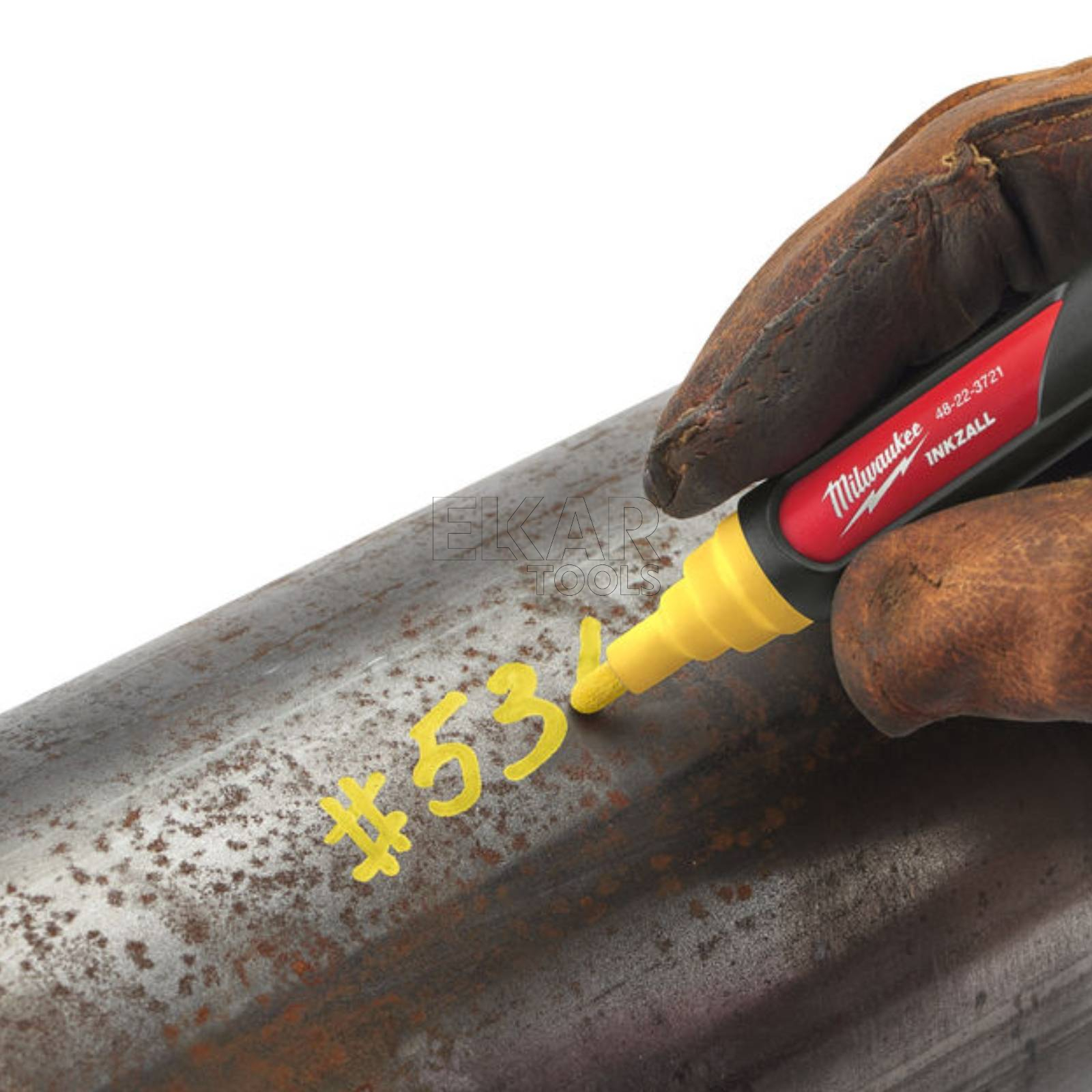 Marker olejowy żółty INKZALL Milwaukee 48223721 to profesjonalne narzędzie do trwałego i wyraźnego znakowania w najtrudniejszych warunkach pracy. Dzięki specjalnej formule tuszu na bazie oleju marker doskonale sprawdza się na gładkich, zabrudzonych, zaolejonych, mokrych, a nawet gorących powierzchniach – takich jak metal, beton, szkło, tworzywa sztuczne czy rury.