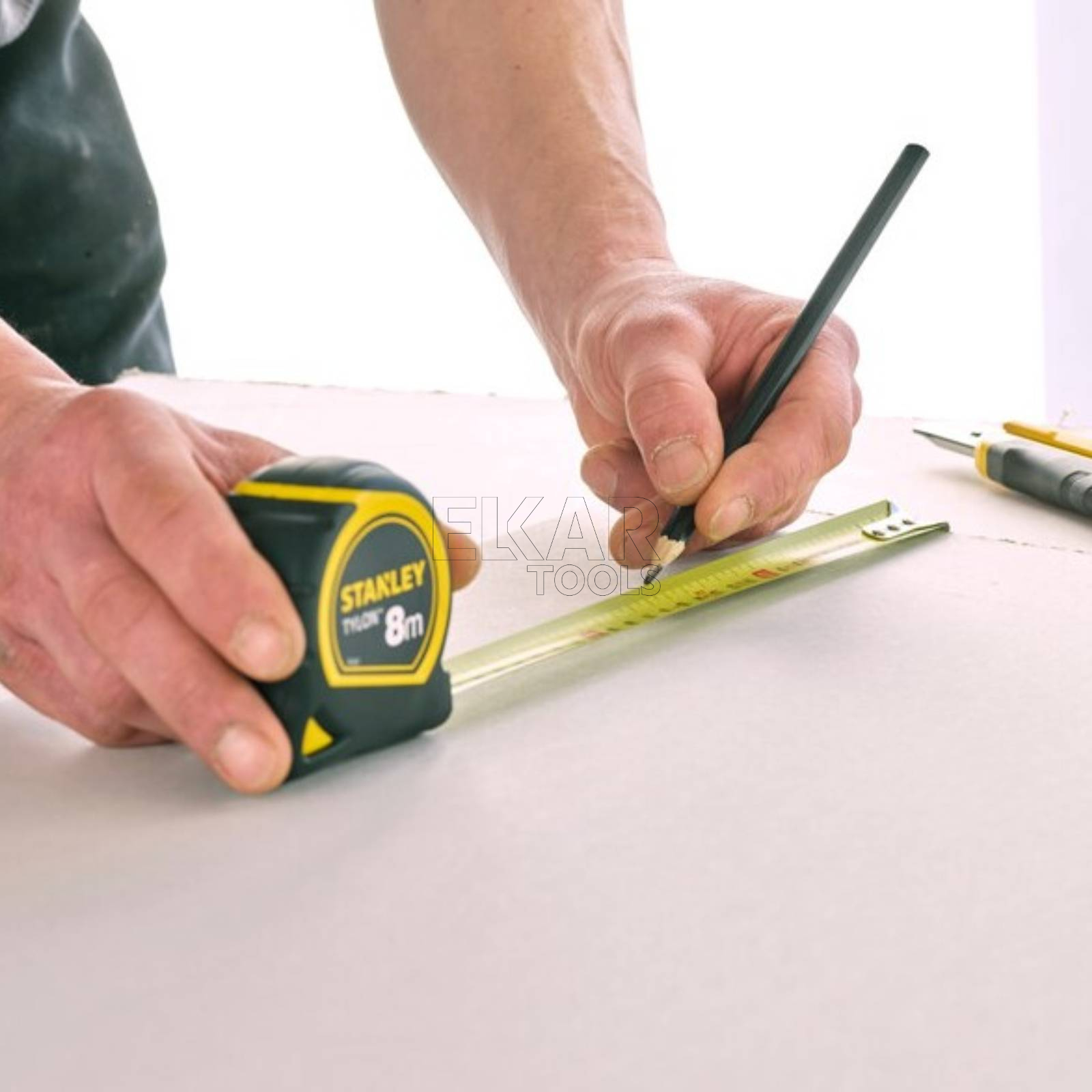 Miara zwijana Stanley Tylon 8m x 25mm 0-30-657 to wysokiej jakości narzędzie pomiarowe, które łączy precyzję z trwałością. Dzięki zastosowanej powłoce Tylon™, taśma jest odporna na zużycie, co gwarantuje długotrwałą ochronę podziałki. Skala metryczna jest wyraźnie oznaczona, a cyfry umieszczone w centralnej części taśmy minimalizują ryzyko błędnych odczytów. Miara posiada szerokość taśmy 25 mm, co zapewnia stabilność i łatwość w użyciu.