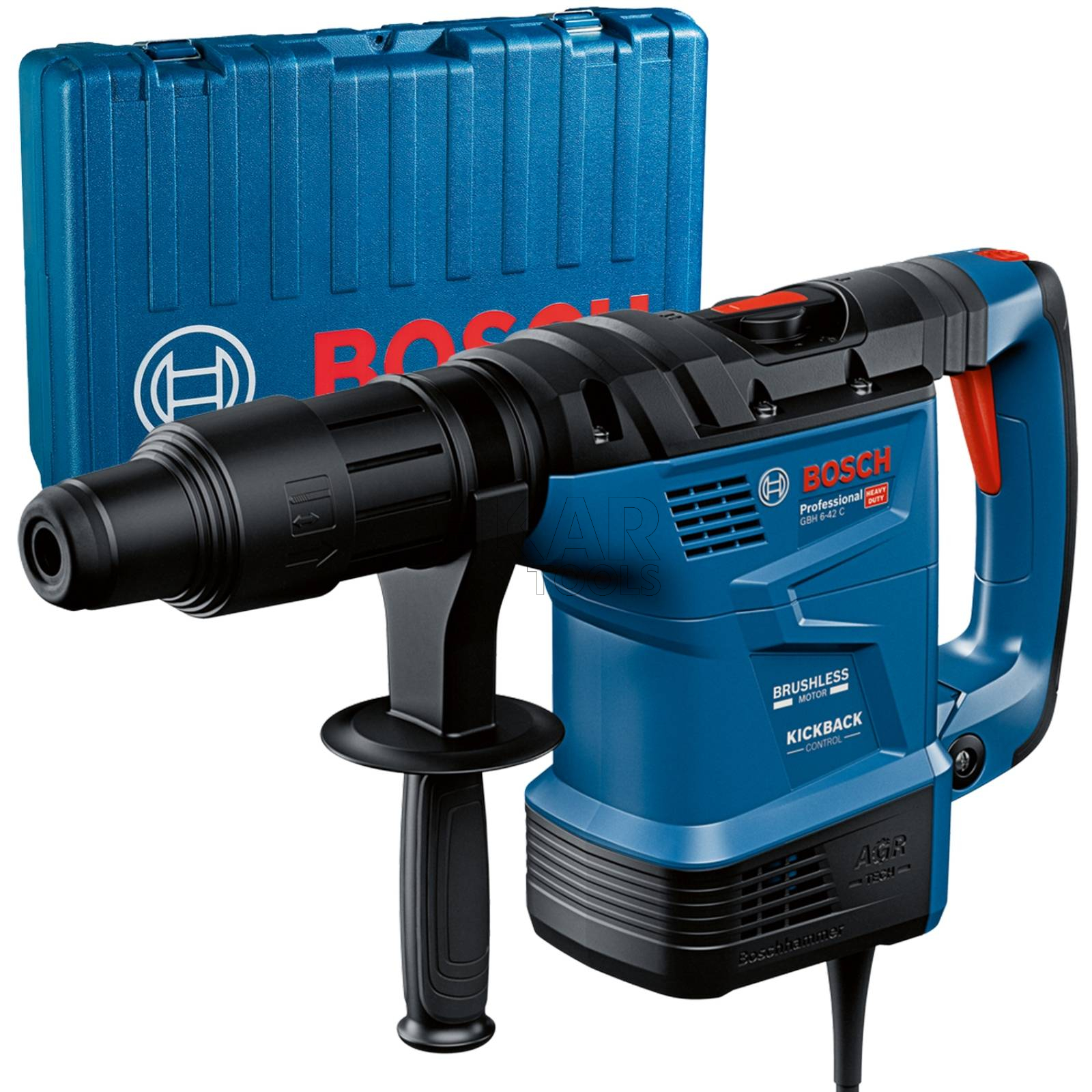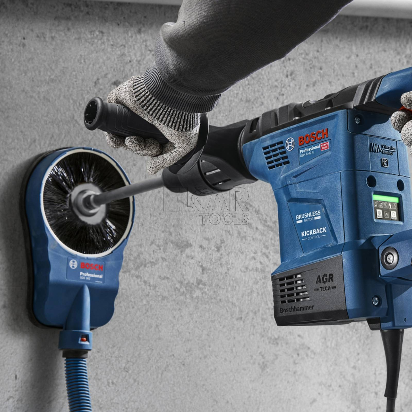 GBH 6-42 C Professional to wszechstronny młot udarowo-obrotowy z uchwytem SDS max, idealny do wiercenia i dłutowania w twardych materiałach, takich jak beton, kamień i mur. Można go używać do pracy we wszystkich kierunkach, a maks. średnica wiercenia wynosi 42 mm. Wymagające prace związane z wierceniem i dłutowaniem mogą być wyczerpujące i niosą ze sobą ryzyko spowodowane możliwością zablokowania narzędzia w materiale, utraty panowania nad maszyną lub narażenia na silne drgania. Nasz młot udarowo-obrotowy GBH 6-42C Professional 2 w 1, przeznaczony do wymagających prac, zapewnia wytrzymałość, wydajność i najwyższy standard ochrony przed urazami ramion i zmęczeniem podczas pracy, ponieważ jest wyposażony w zaawansowane rozwiązania, takie jak sprzęgło bezpieczeństwa, funkcja KickBack Control i system Vibration Control. Aplikacja dla inteligentnych narzędzi BeConnected jest wyposażona w wysokiej klasy interfejs użytkownika, który w czasie rzeczywistym informuje o stanie narzędzia, umożliwia zaplanowanie konserwacji oraz ułatwia wybór idealnego trybu pracy. Silnik bezszczotkowy oraz system Auto-Gear Rotation zapewniają wysoką wydajność pracy poprzez ograniczenie przestojów związanych z konserwacją lub awariami.