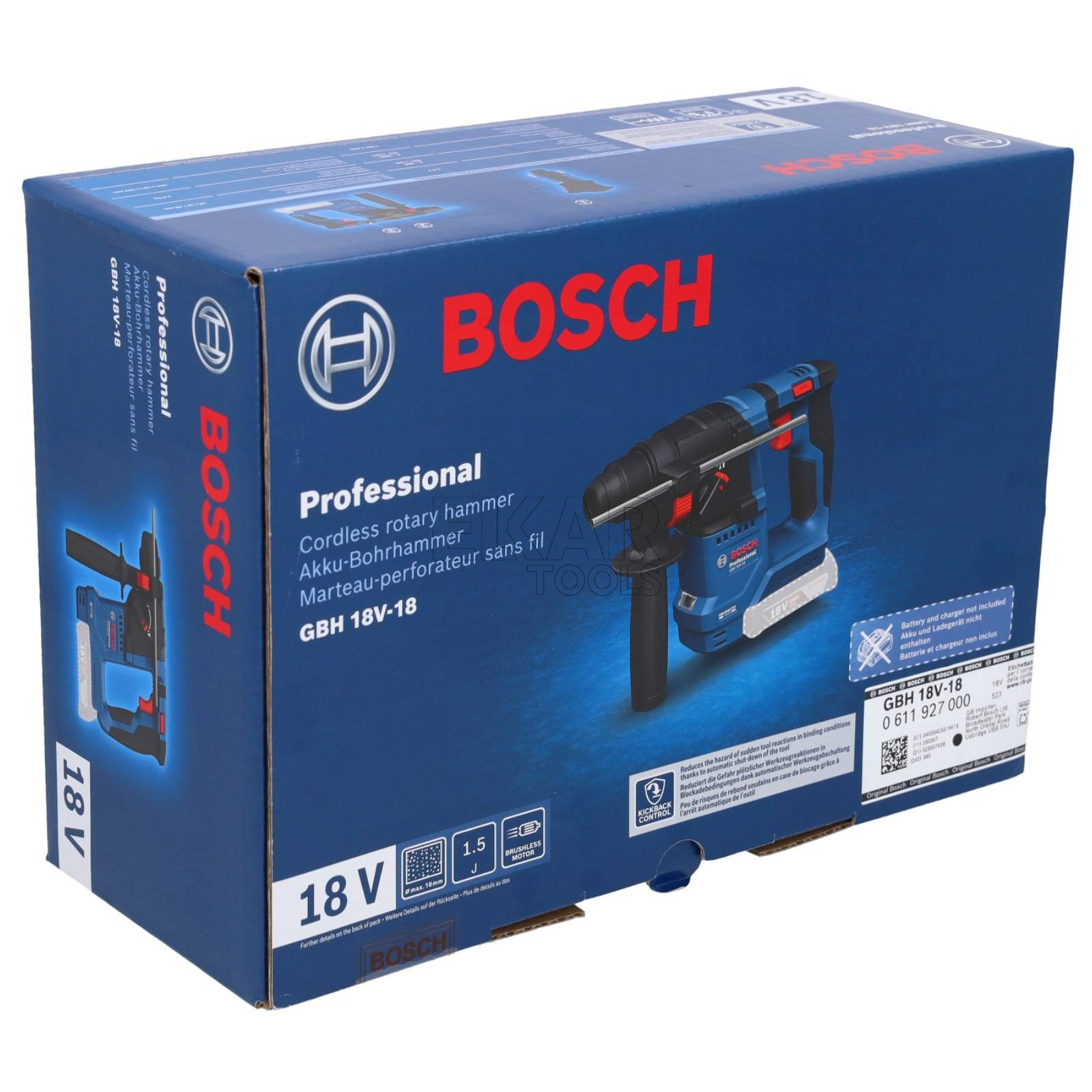 Młot udarowo-obrotowy Bosch GBH 18V-18 Professional to narzędzie właśnie dla Ciebie. Ten kompaktowy, ale wydajny młot akumulatorowy jest wyposażony w funkcję KickBack Control, która zapewnia, że silnik zatrzymuje się natychmiast po wykryciu zaklinowania wiertła w materiale, zapobiegając typowym obrażeniom, do których może dojść w wyniku odrzutu. System Vibration Control tłumi drgania, redukując ryzyko drętwienia dłoni i ramienia podczas pracy. Ten lekki młot akumulatorowy zapewnia pełną wydajność nawet przy zastosowaniu akumulatora 18 V / 2,0 Ah, dzięki czemu ekstremalna moc wydaje się odczuwalnie lżejsza. Jedno ładowanie akumulatora wystarcza do wywiercenia nawet 50 otworów w betonie dzięki solidnemu silnikowi bezszczotkowemu, który zapewnia stabilną moc wyjściową i stałą prędkość obrotową. Młot udarowo-obrotowy GBH 18V-18 Professional firmy Bosch jest wyposażony w wytrzymały silnik bezszczotkowy i można go używać do wiercenia udarowego w betonie oraz wiercenia w drewnie lub metalu. Posiada także funkcję KickBack Control i system Vibration Control.
