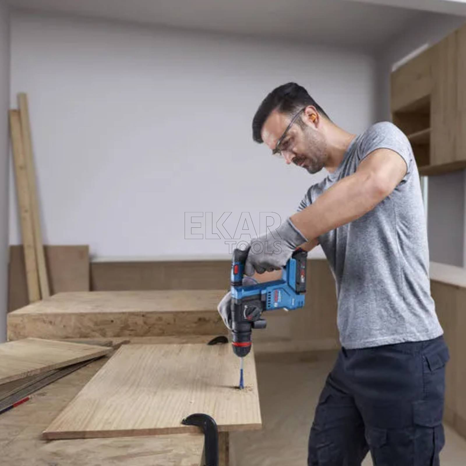 Młot udarowo-obrotowy Bosch GBH 18V-18 X Professional to narzędzie właśnie dla Ciebie. Kompaktowy, ale wydajny młot akumulatorowy jest wyposażony w jeden uchwyt ONECHUCK, który pasuje do wierteł SDS plus, wierteł z chwytem cylindrycznym i sześciokątnym, co umożliwia szeroki zakres zastosowań oraz m.in. pracę w betonie, drewnie i metalu. Funkcja KickBack Control zapewnia, że silnik zatrzymuje się natychmiast po wykryciu zaklinowania się wiertła w materiale, zapobiegając typowym obrażeniom, do których może dojść w wyniku odrzutu. System Vibration Control tłumi drgania, redukując ryzyko drętwienia dłoni i ramienia podczas pracy. Ten lekki młot akumulatorowy zapewnia pełną wydajność nawet przy zastosowaniu akumulatora 18 V / 2,0 Ah, dzięki czemu ekstremalna moc wydaje się odczuwalnie lżejsza. Jedno ładowanie akumulatora wystarcza do wywiercenia nawet 50 otworów w betonie dzięki solidnemu silnikowi bezszczotkowemu, który zapewnia stabilną moc wyjściową i stałą prędkość obrotową. Młot udarowo-obrotowy GBH 18V-18 X Professional firmy Bosch jest wyposażony w wytrzymały silnik bezszczotkowy i uchwyt ONECHUCK, który pasuje do wierteł SDS plus, cylindrycznych i sześciokątnych oraz można go używać do wiercenia udarowego w betonie i wiercenia w drewnie lub metalu. Posiada także funkcję KickBack Control i system Vibration Control.