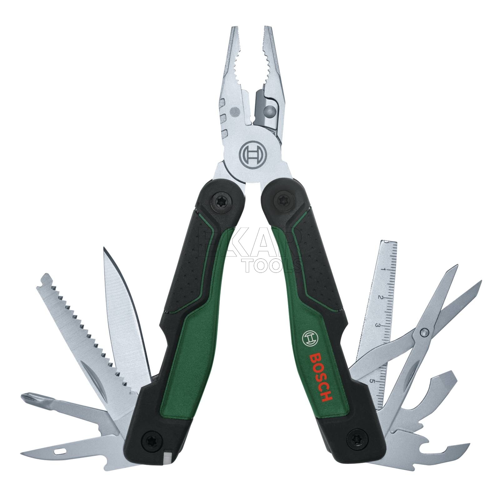 Multitool 16 w 1 marki Bosch to narzędzie, którego nie może zabraknąć w warsztacie, szafce w kuchni lub podczas wakacyjnych wypraw. Zawiera różne wkrętaki i szczypce, szczypce do cięcia drutu, piłę, nóż, nożyczki, szydło z otworem na nić, otwieracz do butelek i otwieracz do puszek, wykałaczkę, pęsetę oraz linijkę, dzięki czemu świetnie nadaje się do różnych zadań związanych z majsterkowaniem w domu lub na kempingu, a także do czynności pielęgnacyjnych.