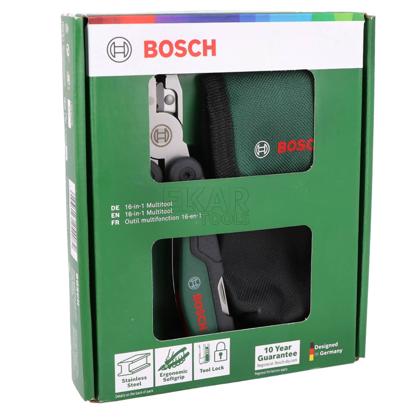 Potrzebujesz wyjąć drobne gwoździe lub odkręcić wkręty albo przepiłować nieduże kawałki drewna? Multitool 16 w 1 marki Bosch to narzędzie, którego nie może zabraknąć w warsztacie, szafce w kuchni lub podczas wakacyjnych wypraw. Zawiera różne wkrętaki i szczypce, szczypce do cięcia drutu, piłę, nóż, nożyczki, szydło z otworem na nić, otwieracz do butelek i otwieracz do puszek, wykałaczkę, pęsetę oraz linijkę, dzięki czemu świetnie nadaje się do różnych zadań związanych z majsterkowaniem w domu lub na kempingu, a także do czynności pielęgnacyjnych.