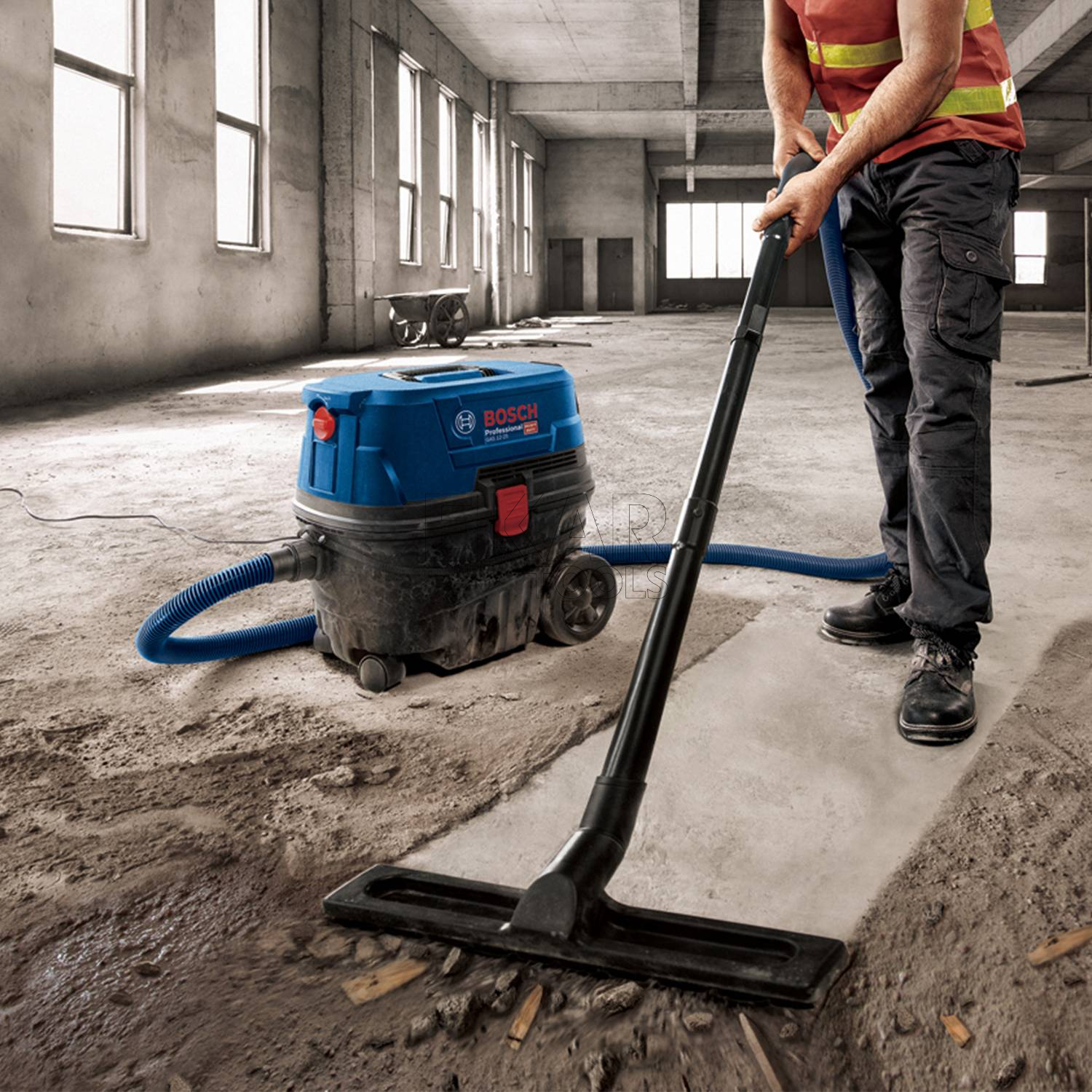 Bardzo mocny odkurzacz od Bosch Professional. Zasysa wszystko, co mu podejdzie, kurz, trociny, śrubki itp. Widać, że jest markowy.