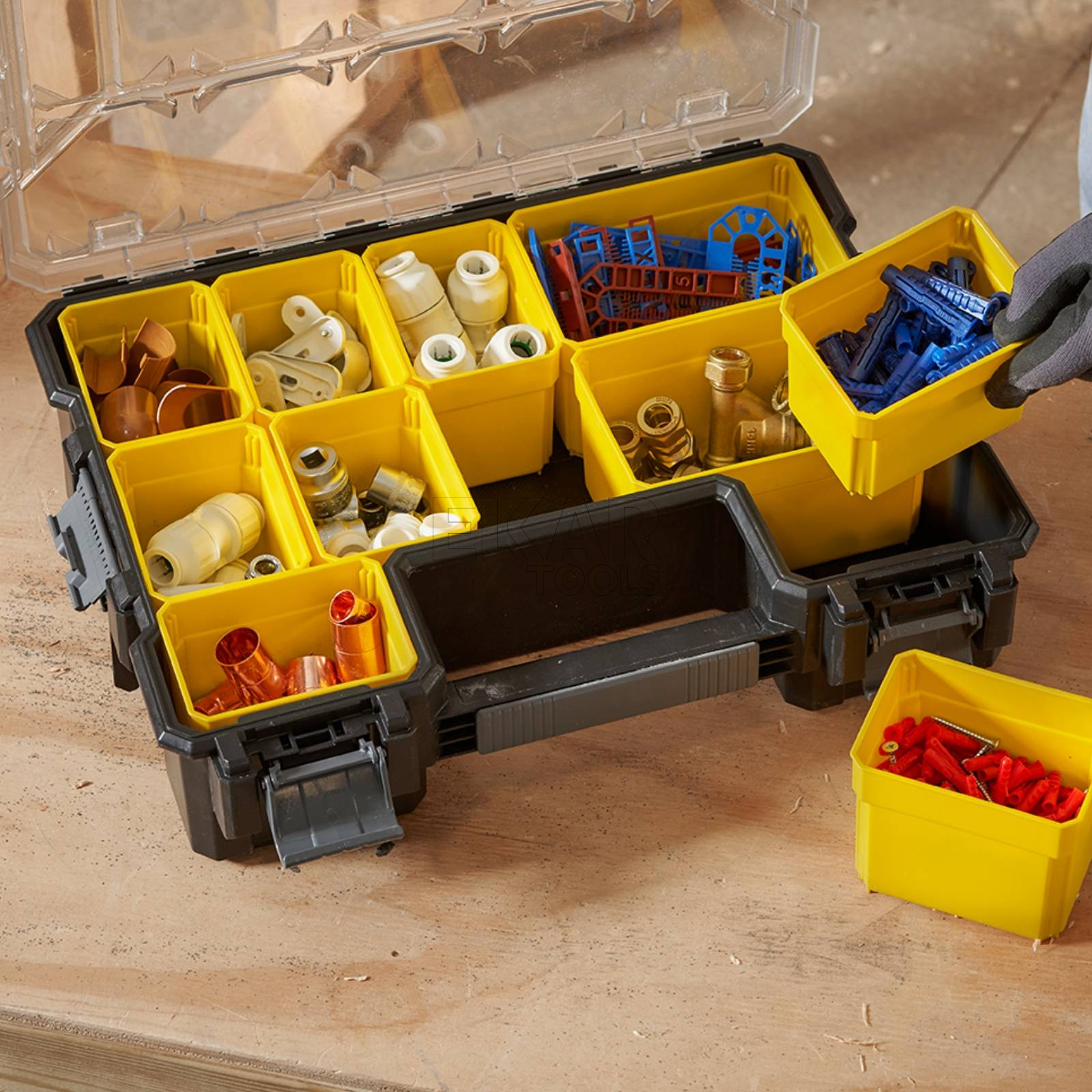 Organizer Stanley Deep Pro 1-97-521 to duża, solidna skrzynka z przegródkami, zaprojektowana z myślą o wygodnym przechowywaniu i organizacji narzędzi oraz drobnych akcesoriów. Wykonany z wytrzymałego tworzywa sztucznego, zapewnia wysoką odporność na uszkodzenia mechaniczne i intensywne użytkowanie. Przeźroczysta, wzmocniona poliwęglanowa pokrywa umożliwia szybki podgląd zawartości bez konieczności otwierania organizera. Wewnątrz znajduje się system regulowanych przegródek, który pozwala dostosować układ przestrzeni do indywidualnych potrzeb. Dzięki głębokim komorom idealnie nadaje się do przechowywania większych elementów, takich jak śruby, nakrętki, wkręty, a nawet mniejsze narzędzia ręczne. Solidne zatrzaski oraz ergonomiczny uchwyt ułatwiają transport i gwarantują bezpieczeństwo przechowywanych przedmiotów. Stanley Deep Pro to doskonałe rozwiązanie dla profesjonalistów i majsterkowiczów, którzy cenią porządek oraz łatwy dostęp do niezbędnych akcesoriów.