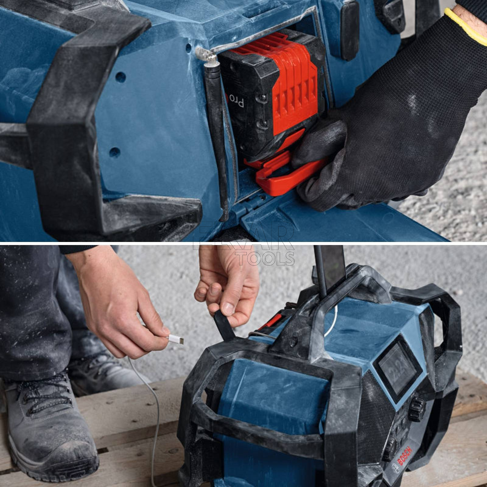 - Wysokiej mocy radio budowlane z funkcją ładowania, który uprzyjemnia pracę – działa z akumulatorami 12 V i 18 V