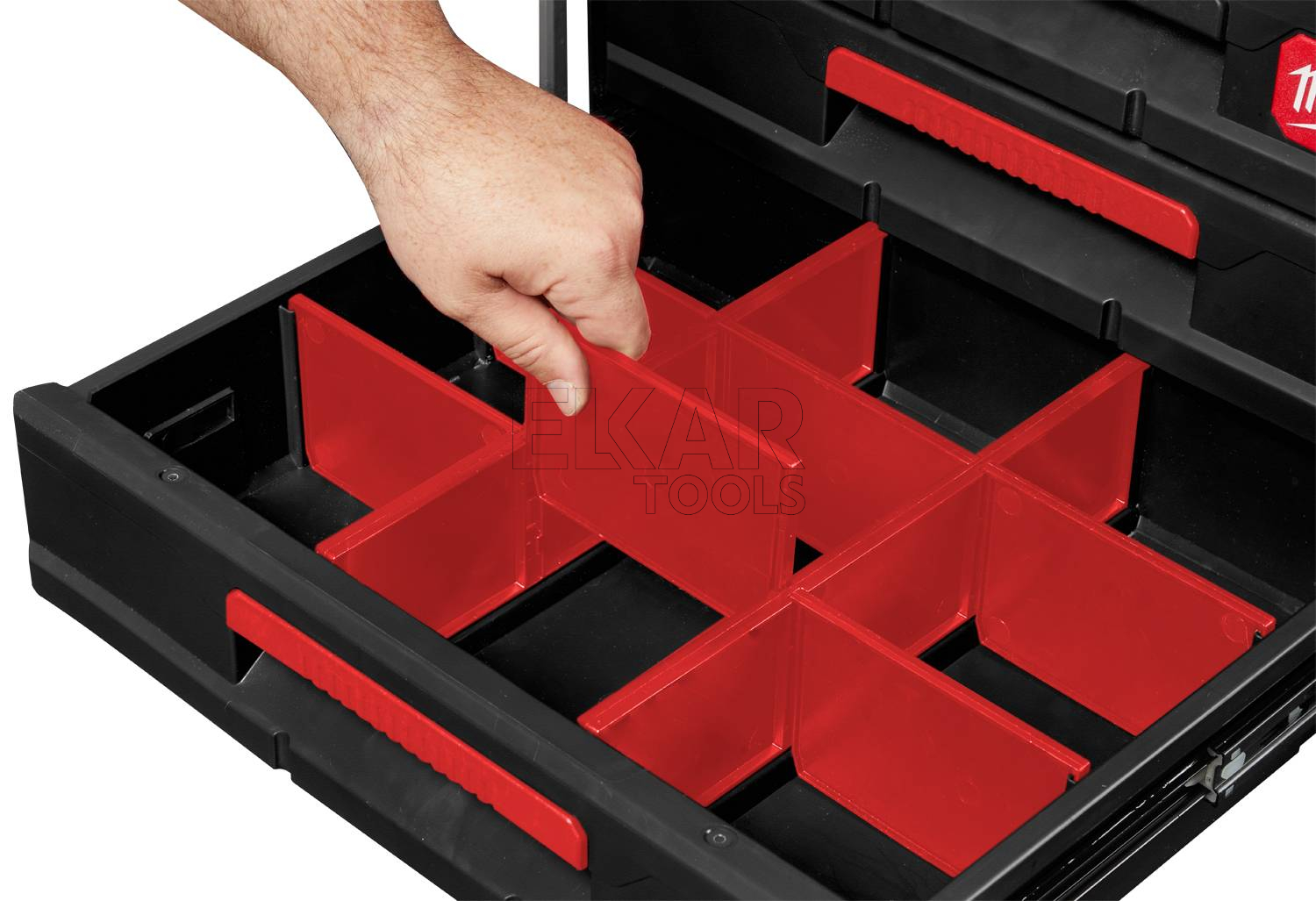 - Każda skrzynia z szufladami posiada w zestawie regulowane przegródki, co umożliwiają wygodną organizację i przechowywanie różnych akcesoriów i narzędzi ręcznych.