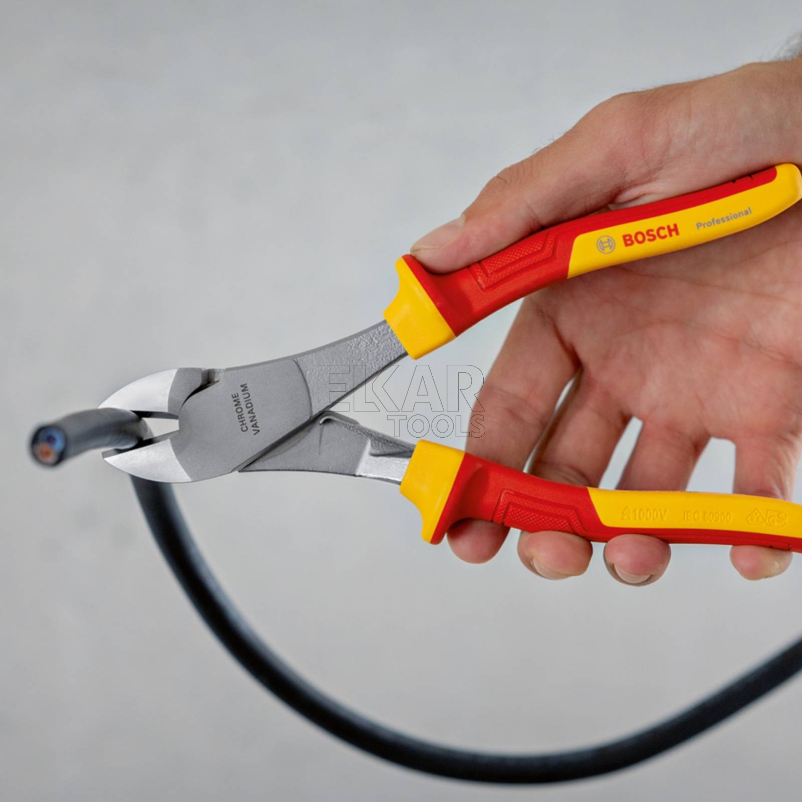 - Izolowane, proste w użyciu i komfortowe szczypce boczne o zwiększonej sile nacisku VDE Bosch Professional – 200 mm