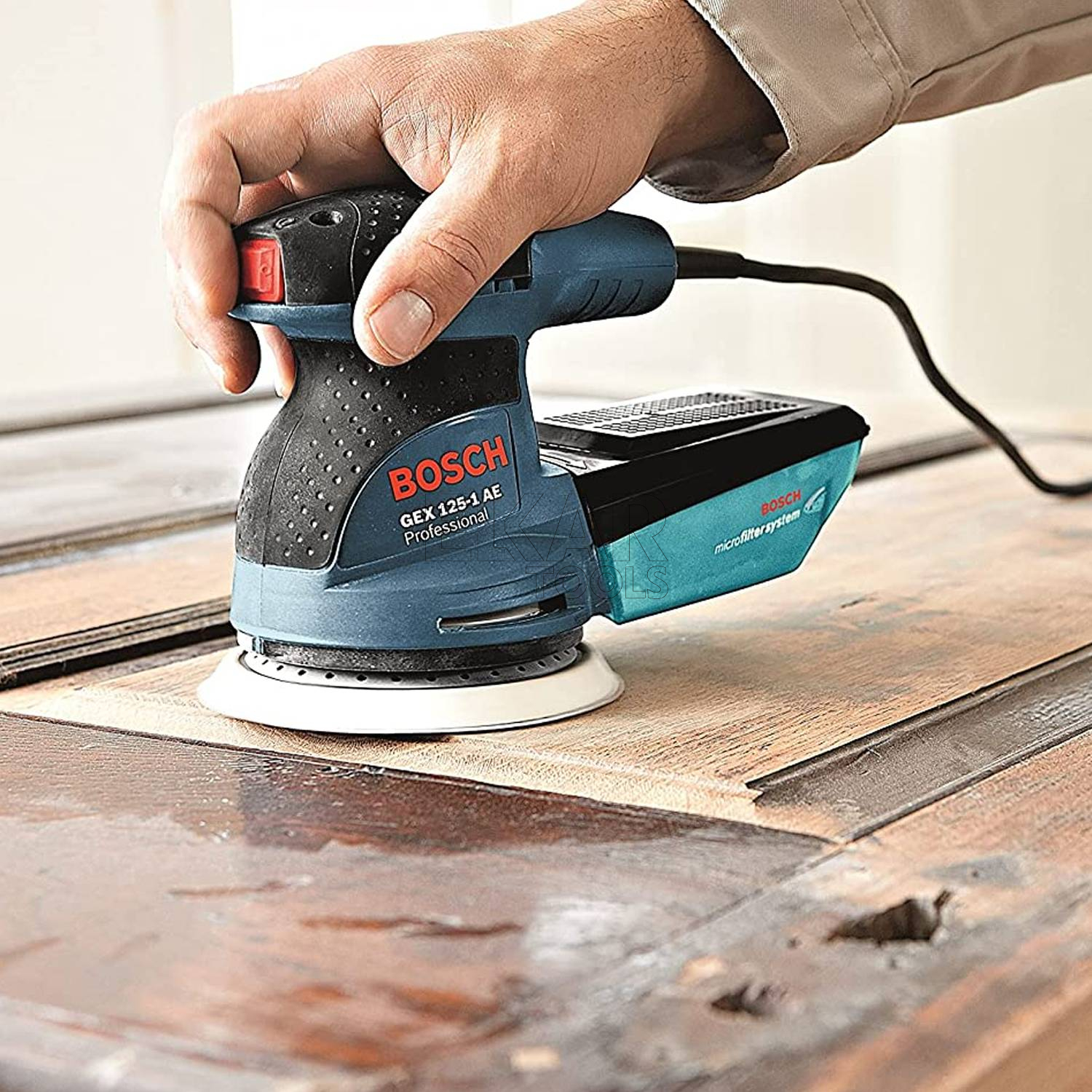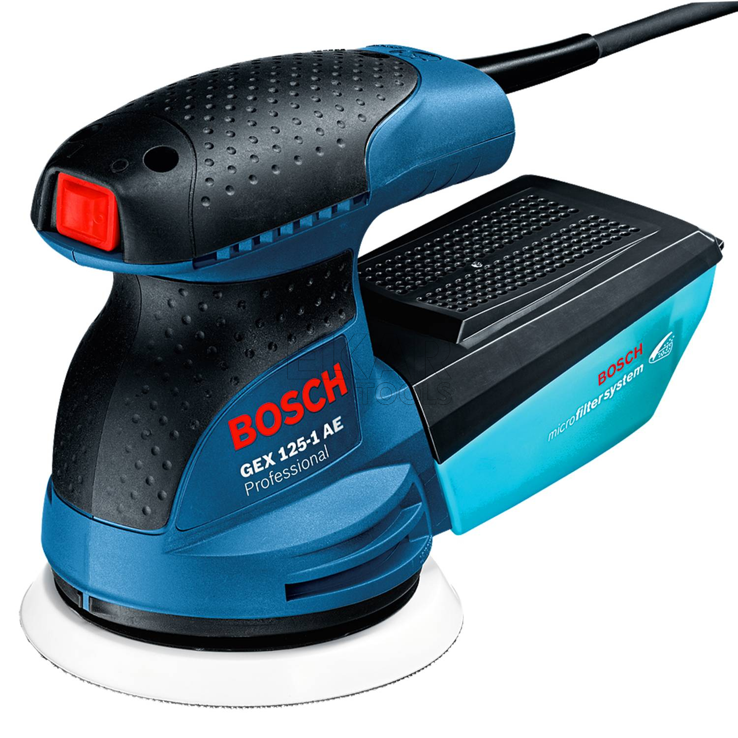 Model GEX 125-1 AE Professional jest wyposażony także w talerz szlifierski z systemem mocowania na rzepy umożliwiającym szybkie zakładanie papieru ściernego. GEX 125-1 AE Professional to podstawowy model w gamie sieciowych szlifierek mimośrodowych firmy Bosch w kategorii 125 mm, przeznaczony do obróbki mniejszych powierzchni i naprawy punktowych uszkodzeń. Jego kompaktowa i ergonomiczna konstrukcja umożliwia wiele pozycji ułożenia rąk i oferuje wyjątkowy komfort także podczas prac wymagających trzymania narzędzia w górze. Wstępna regulacja prędkości umożliwia wykorzystanie narzędzia do obróbki wielu materiałów. Pojemnik na pył jest wyposażony we wbudowany system mikrofiltracji Bosch, zapewniając efektywny system odsysania pyłu oraz praktycznie bezpyłową pracę. Ten model szlifierki mimośrodowej jest przeznaczony do szlifowania, szlifowania przygotowawczego, usuwania lakierów i wykończenia powierzchni różnego rodzaju materiałów. Można ją stosować do szlifowania drewna, werniksu, lakieru, wypełniaczy, a także powierzchni mineralnych i akrylowych. Urządzenie jest kompatybilne z systemem odsysania pyłu Bosch Click & Clean.
