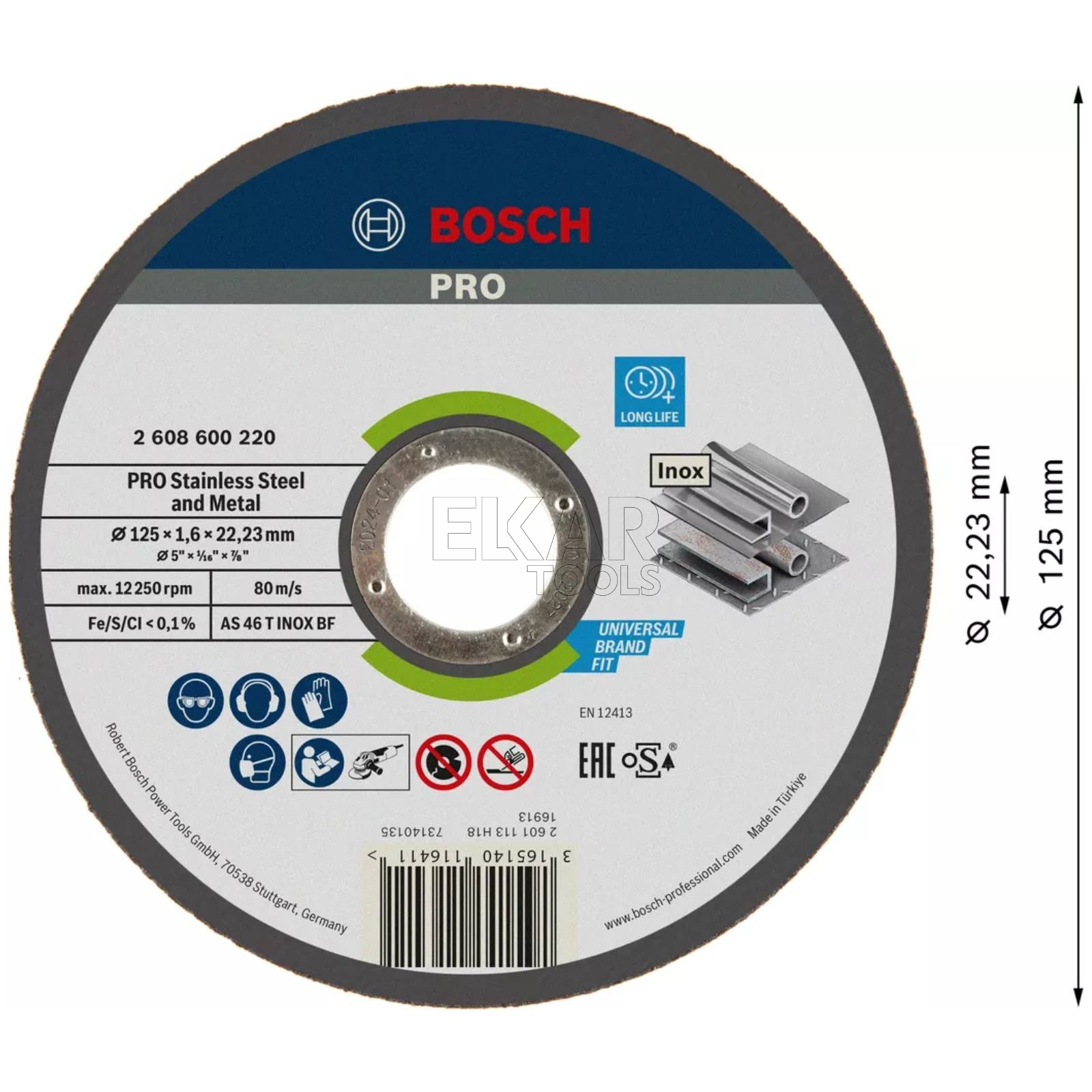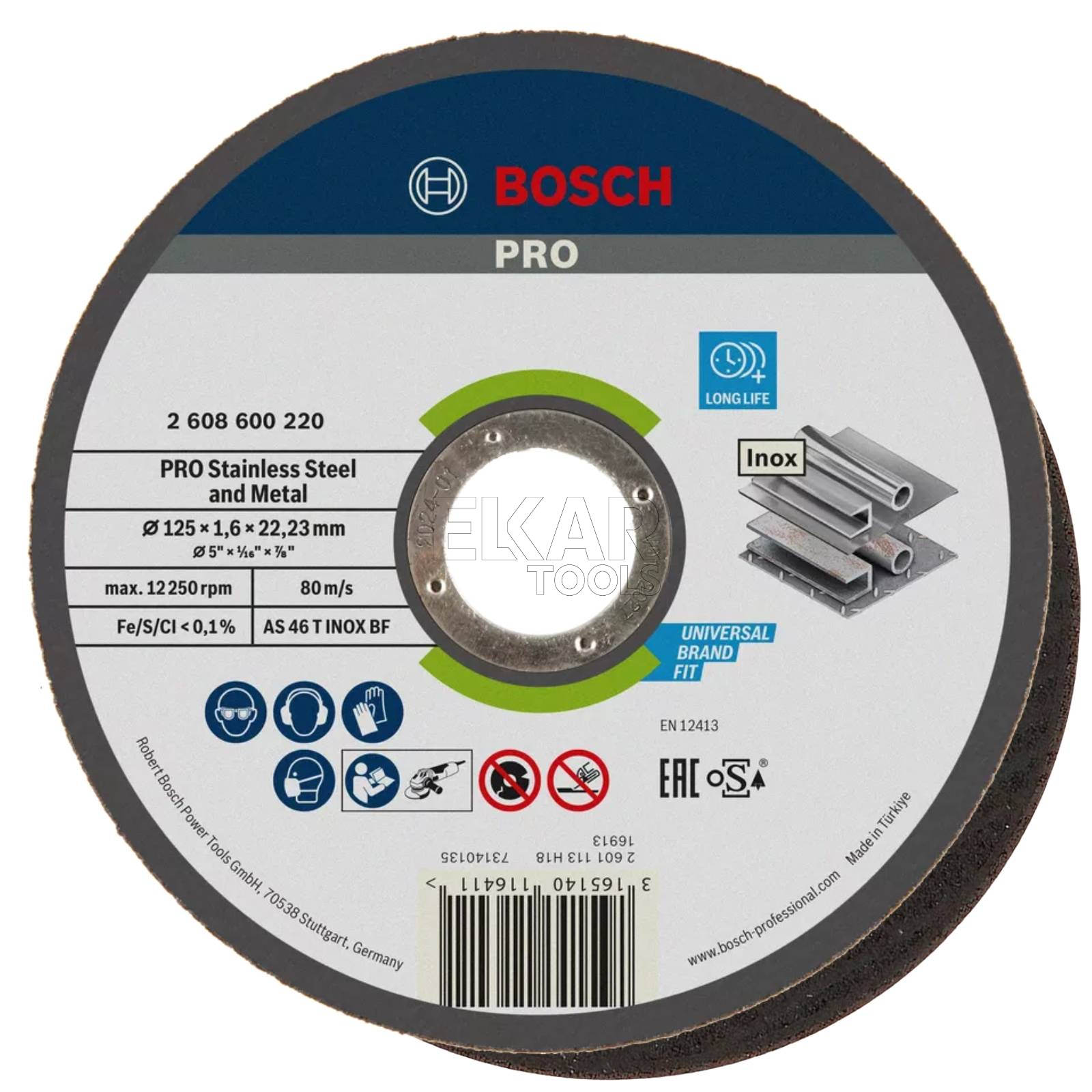 - Rodzaj tarczy: korundowa tarcza tnąca PRO Stainless Steel and Metal, 125 × 1,6 × 22,23 mm, prosta, oSa