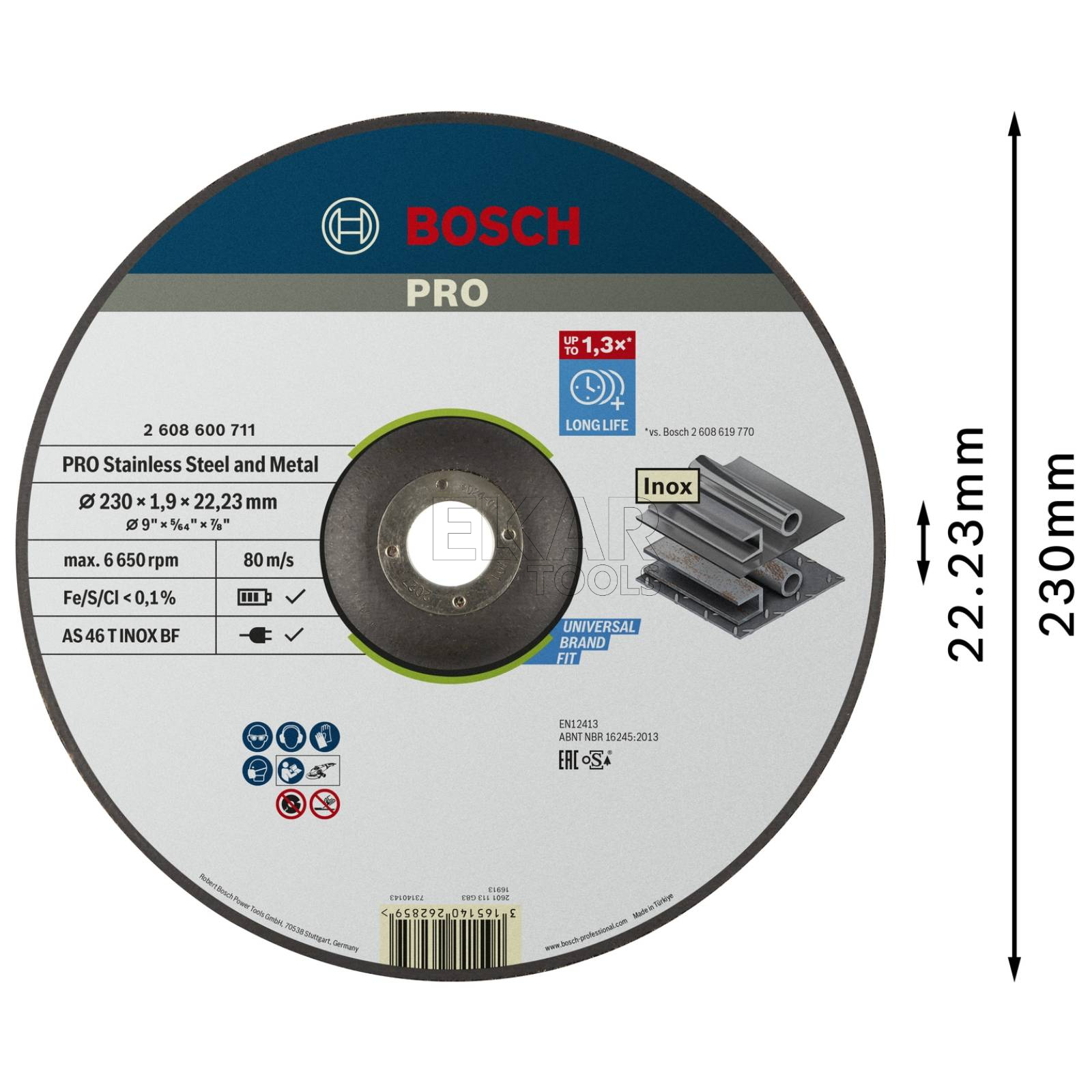 - Rodzaj tarczy: korundowa tarcza tnąca PRO Stainless Steel and Metal, 230 × 1,9 × 22,23 mm, z obniżonym środkiem