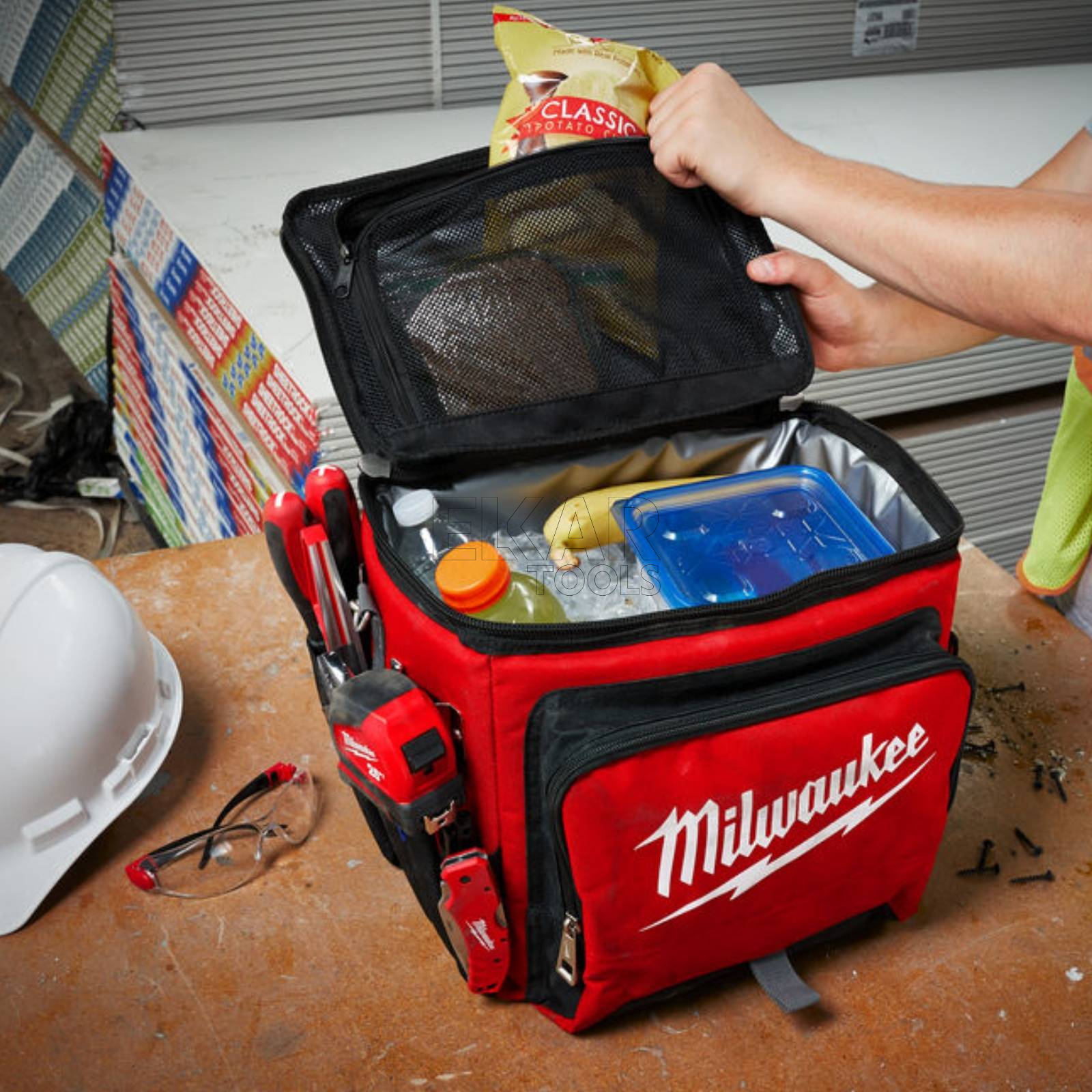 Torba termoizolacyjna Milwaukee 4932464835 to wytrzymały i funkcjonalny produkt, idealny do przechowywania żywności i napojów w odpowiedniej temperaturze na placu budowy. Wykonana z trwałego nylonu balistycznego 1680D, zapewnia odporność na trudne warunki pracy. Dzięki podwójnej izolacji i szczelnemu, spożywczemu wkładowi, torba utrzymuje lód w stanie zamrożenia przez 24 godziny bez przeciekania. Dodatkowo, wyposażona jest w kieszeń na urządzenia elektroniczne oraz komorę na suche produkty, co czyni ją wszechstronnym rozwiązaniem dla profesjonalistów.