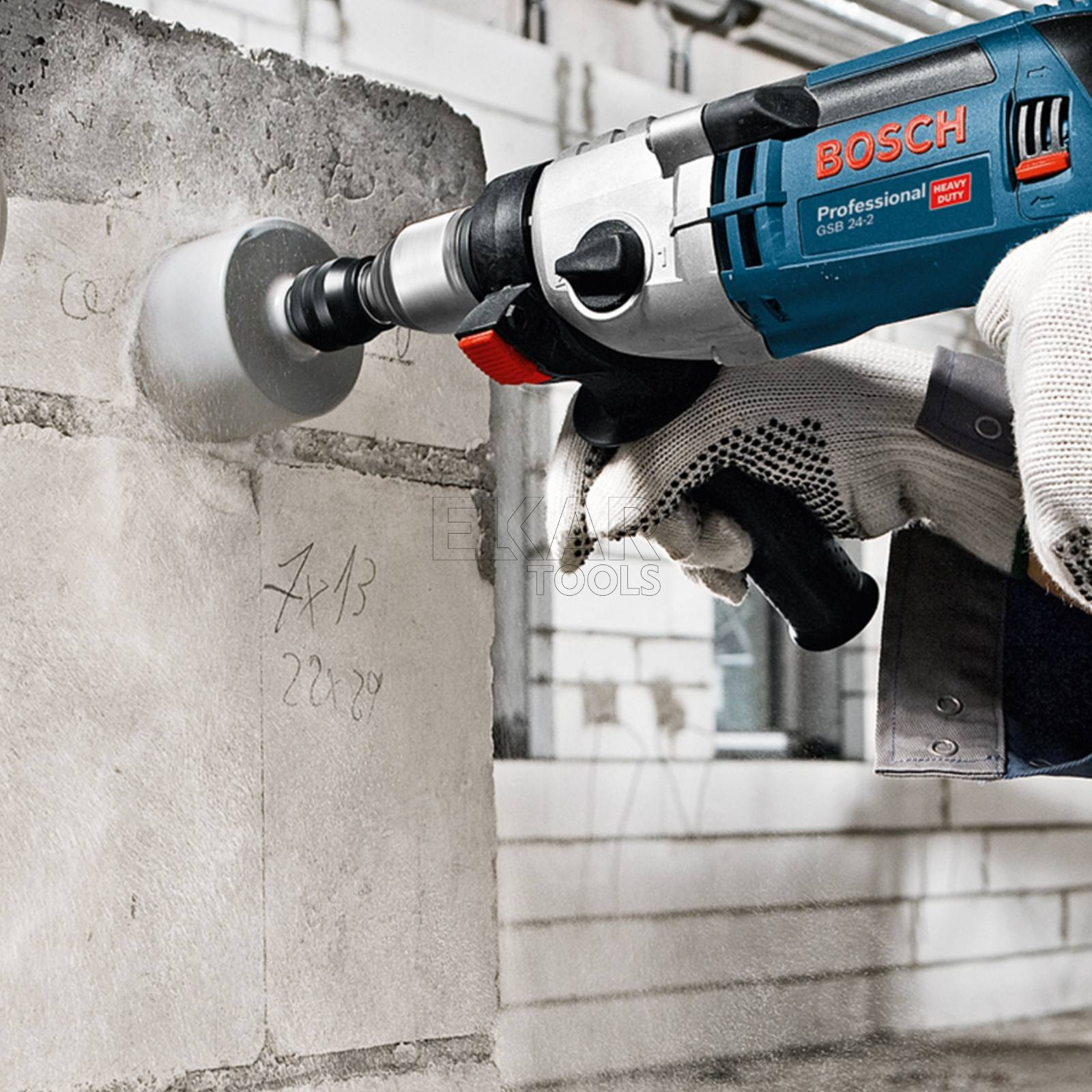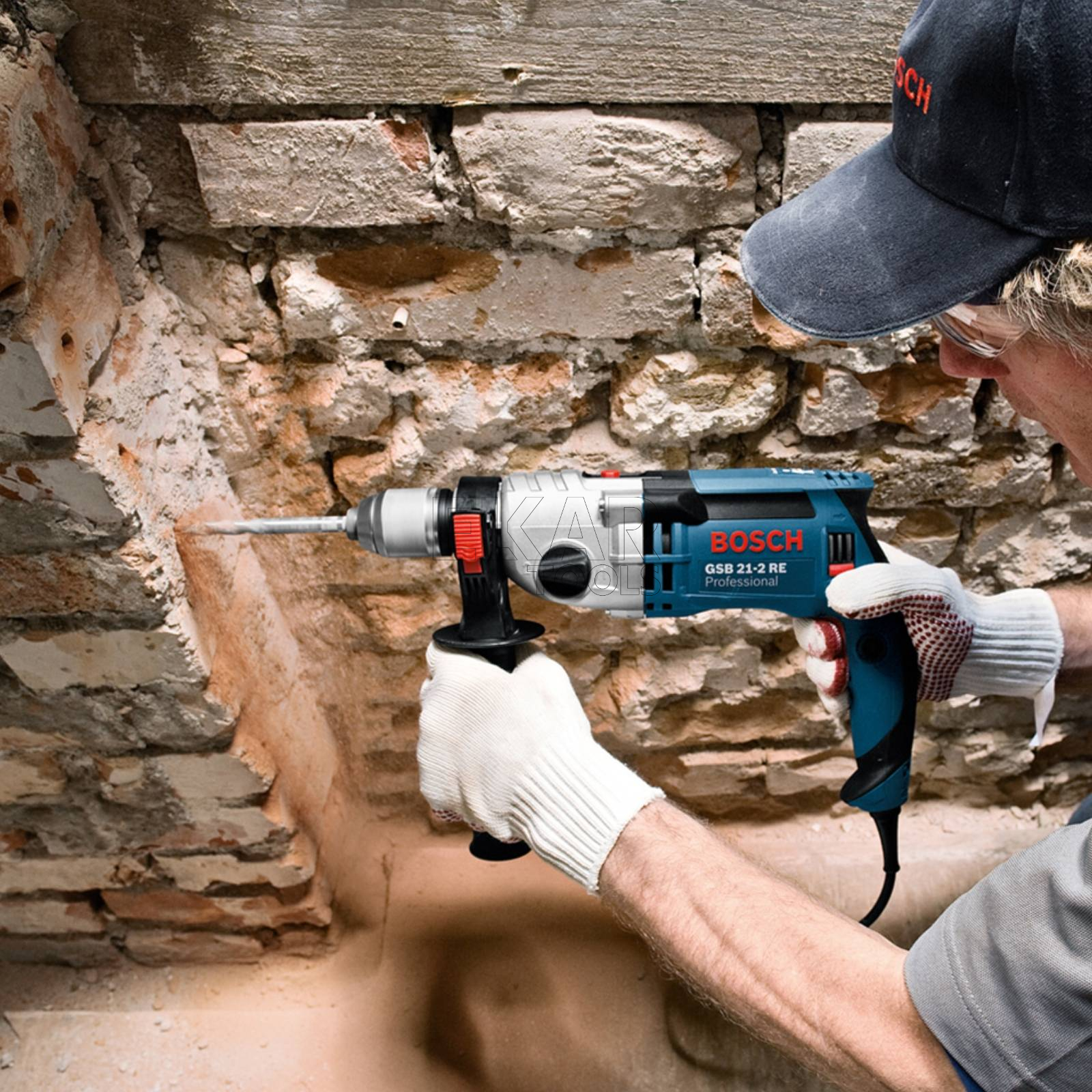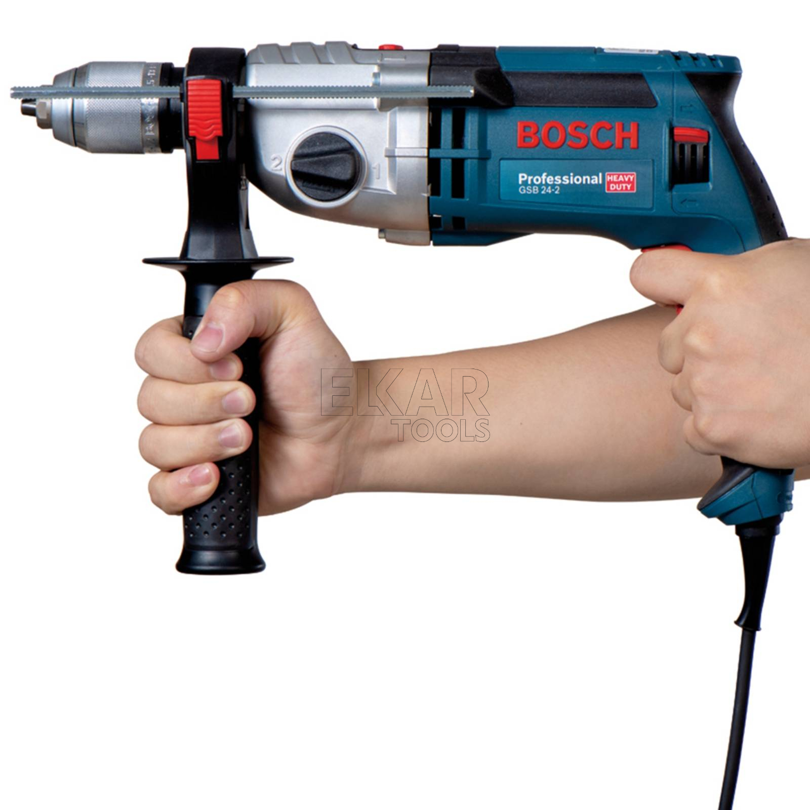 Model GSB 24-2 Professional to 2-biegowa, sieciowa wiertarka udarowa z funkcją KickBack Control, przeznaczona do najcięższych prac. Mocny, wysoce wydajny silnik 1 100 W i wysoki moment obrotowy sprawiają, że jest to idealne narzędzie do najbardziej wymagających prac. Model posiada także funkcję KickBack Control, która zapewnia wyższy standard ochrony użytkownika. Wiertarka udarowa, wyposażona w wytrzymałą, metalową obudowę przekładni jest ekstremalnie trwała i gwarantuje długą żywotność. Elektronarzędzie jest przeznaczone do wiercenia w murze, kamieniu, drewnie i metalu. Narzędzie jest kompatybilne z systemem odsysania pyłu GDE 16 Cyl Professional.