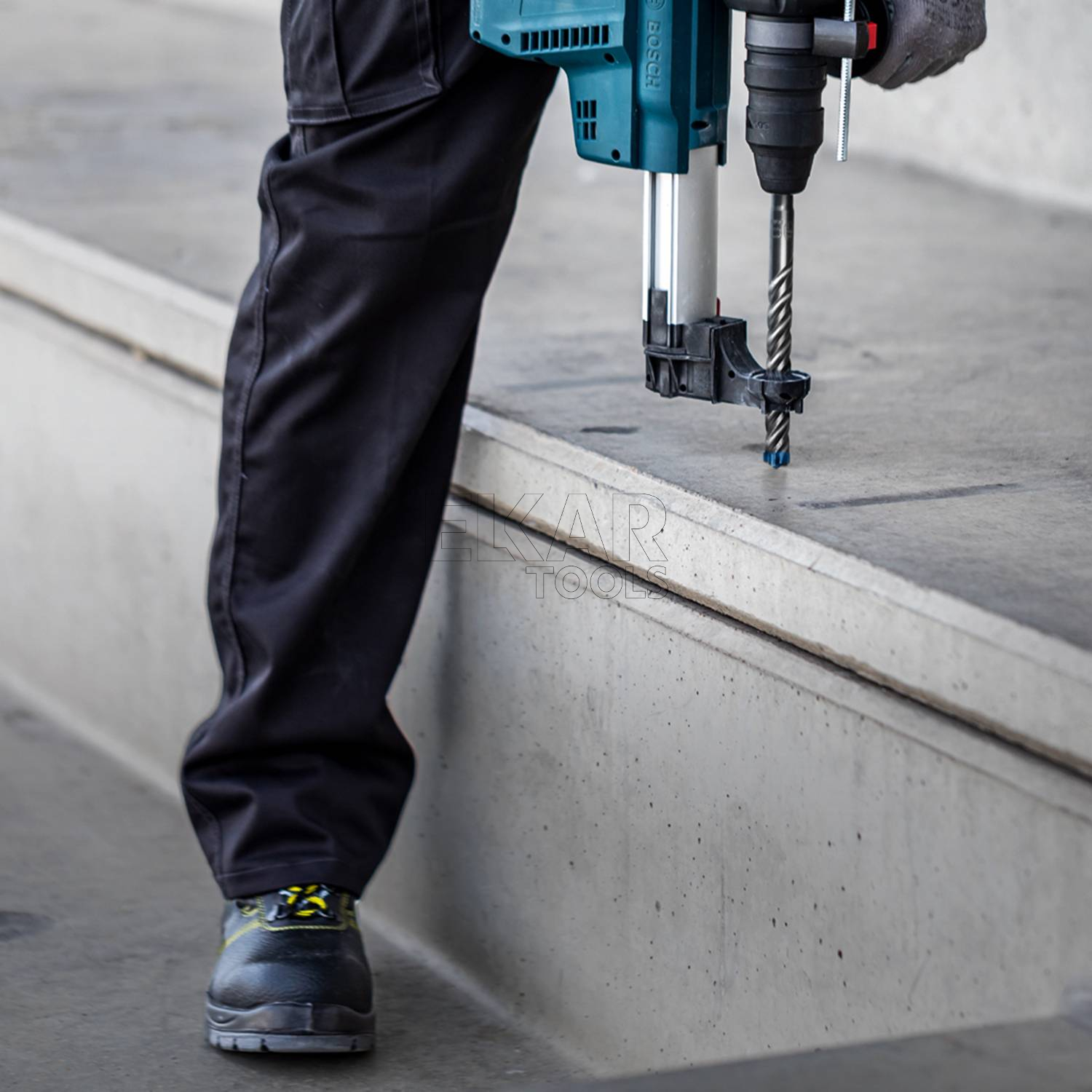 - Wierć w betonie zbrojonym używając czteroostrzowej, w pełni węglikowej głowicy.