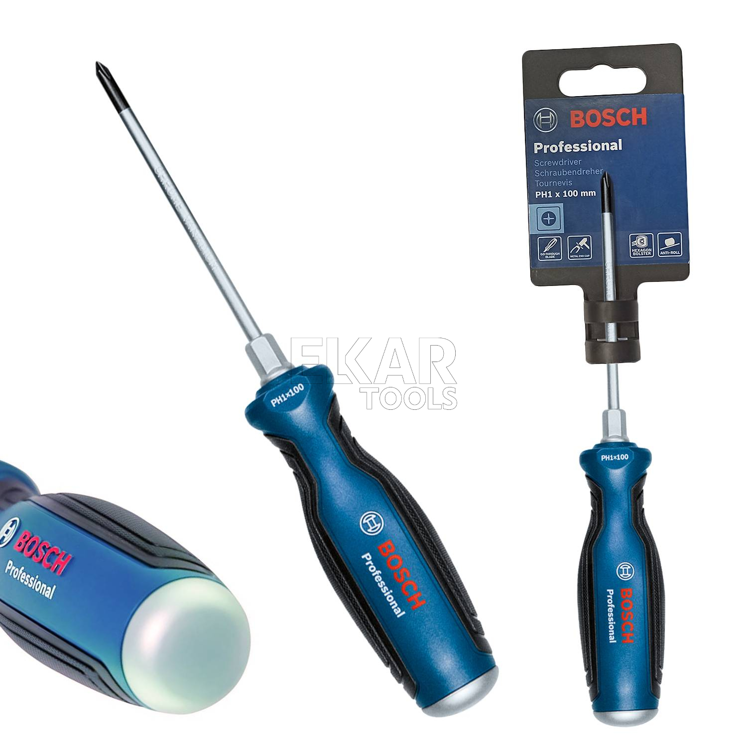 Wkrętak Phillips PH 1 Bosch Professional jest niezwykle wytrzymały dzięki metalowemu grotowi, który przechodzi przez rękojeść, metalowej nasadce udarowej i hartowanej końcówce. Ergonomiczny kształt rękojeści i miękka okładzina Softgrip zapewniają komfortową pracę, a zintegrowana nasadka sześciokątna umożliwia zwiększenie momentu obrotowego dokręcania. Idealny do wkręcania i odkręcania wkrętów mocujących oraz podbijania. Podany na rękojeści rozmiar umożliwia szybką identyfikację wkrętaka właściwego dla danej pracy. Długość grotu 100 mm. Dostępny także w wersji PH2 z grotem o długości 125 mm.
