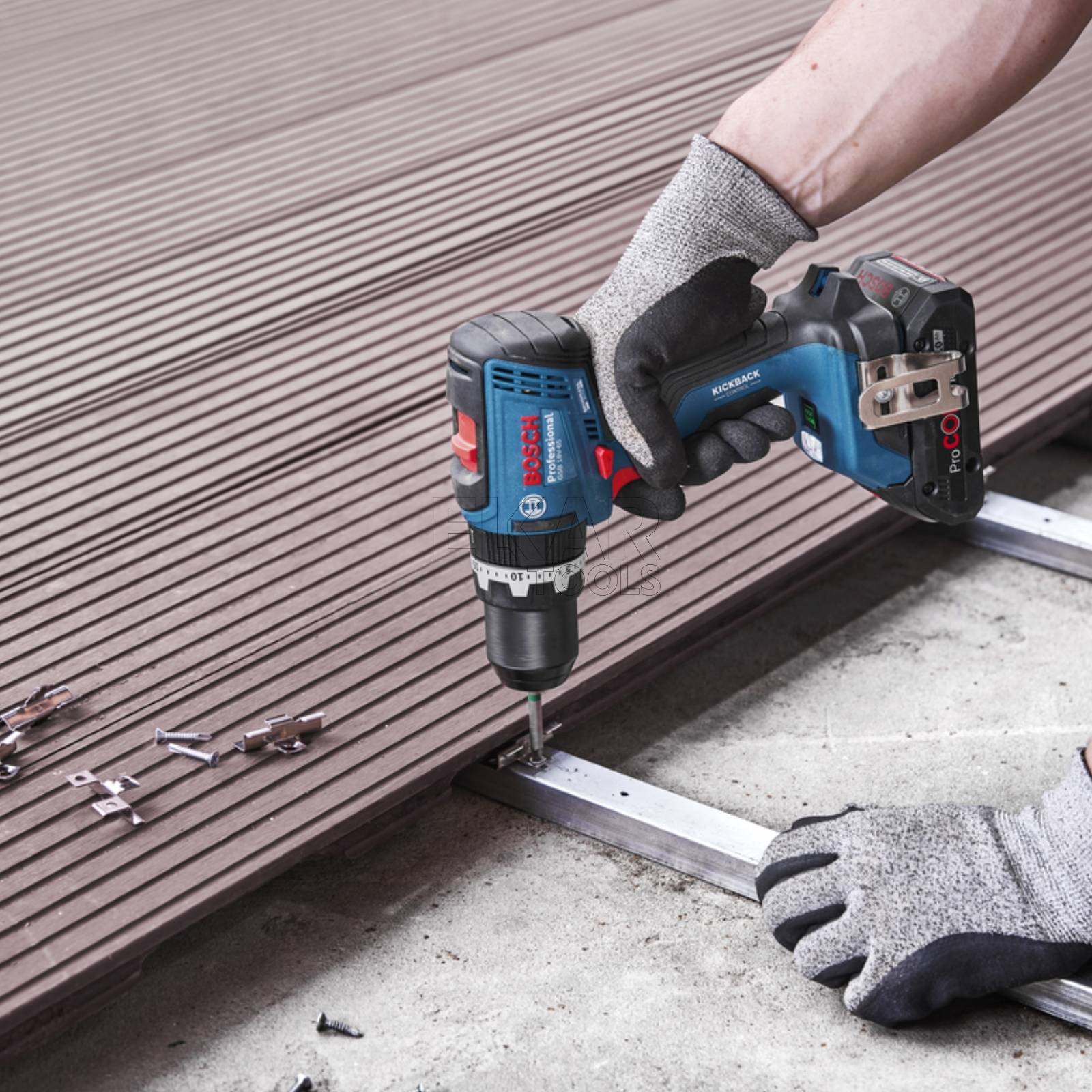 Jeśli szukasz wiertarko-wkrętarki akumulatorowej, która zapewnia odpowiednią moc także do wymagających zastosowań związanych z wkręcaniem, proponujemy Ci wiertarko-wkrętarkę Bosch GSB 18V-65 Professional. Dzięki zoptymalizowanemu momentowi obrotowemu 31/65 Nm i prędkości obrotowej 0 – 550 0 / 0 – 2 100 min⁻¹ elektronarzędzie pozwala z łatwością wiercić w metalu, drewnie i tworzywach sztucznych, posiada także dodatkową funkcję udaru do wiercenia w murze. Praca w ciasnych, nietypowych miejscach nie jest już problemem dzięki kompaktowej długości korpusu narzędzia, która wynosi zaledwie 175 mm. Dbamy także o ochronę użytkownika, oferując dodatkowo włączaną funkcję KickBack Control, która zapobiega odrzutowi elektronarzędzia. Podwójne oświetlenie robocze zapewnia jeszcze lepszą widoczność w miejscu pracy. Wiertarko-wkrętarka Bosch GSB 18V-65 Professional to doskonały wybór podczas wymagających prac związanych z wkręcaniem, który sprawdzi się w przypadku monterów mebli, cieśli, elektryków, wykonawców konstrukcji stalowych i murarzy. Model umożliwia wiercenie otworów o średnicy do 35 mm w drewnie, wkręcanie wkrętów o średnicy do 10 mm w drewnie oraz wiercenie otworów o średnicy do 13 mm w metalu i murze.