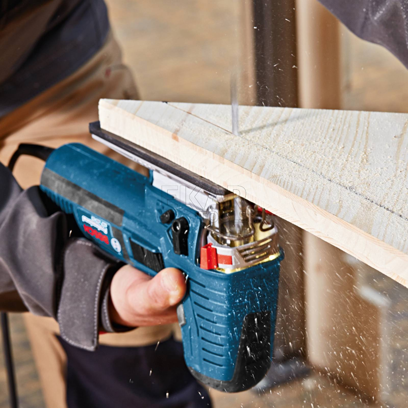 Wyrzynarka sieciowa GST 160 CE Professional 0601517000 oferuje precyzję podczas zastosowań wymagających doskonałego wykończenia. Kompaktowa, lekka konstrukcja oraz wąska rękojeść zapewniają optymalną kontrolę, a rękojeść prosta umożliwia stabilną pracę podczas wykonywania cięć od spodu materiału. Wyrzynarka jest wyposażona w opatentowaną, podwójną rolkę, która zapobiega wyginaniu się brzeszczotu i zapewnia wyjątkową dokładność cięcia. Niezawodny silnik o mocy 800 W i stałej prędkości obrotowej umożliwia cięcia w najtwardszych materiałach.Narzędzie jest przeznaczone do cięć w linii krzywej oraz cięć poprzecznych w litym drewnie, płytach wiórowych i kompozytach drewnianych. Urządzenie jest kompatybilne z systemem odsysania pyłu Bosch Clic k& Clean oraz innymi odkurzaczami Bosch, a także z szynami prowadzącymi (z dodatkowym adapterem).