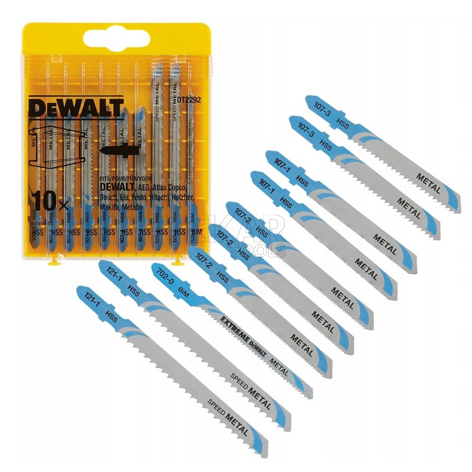 - Zestaw 10szt. brzeszczotów do wyrzynarek firmy DeWALT DT2292 z mocowaniem typu T, przeznaczonych do użytku z elektronarzędziami marek: Bosch, DeWalt, Hitachi, Makita, Festool, Metabo itp.