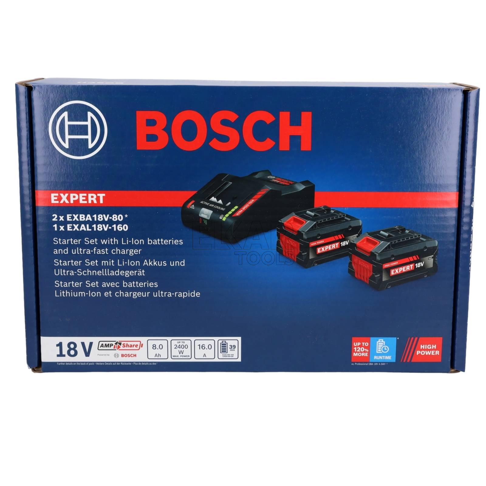 Akumulator EXBA18V-80 jest wyposażony we wskaźnik z 5 diodami LED, który wyświetla stan naładowania, pozostałą energię akumulatora, a także wykrywa ryzyko usterek. Mobilna, ultraszybka ładowarka do ładowania równoległego posiada także 5 diod LED, które precyzyjnie wskazują stan naładowania. Ta ultraszybka ładowarka posiada trzy tryby ładowania: Standardowy, Power Boost i Long Life. Użytkownik może aktywować poszczególne tryby za pomocą przycisku trybu ładowania, w zależności od swoich potrzeb. Tryb Power Boost to dobry wybór, jeśli chcesz naładować akumulator do pełna z maksymalną prędkością. Wybierz tryb Long Life, jeśli chcesz naładować akumulator do pełna w oszczędniejszy sposób, który wydłuża żywotność akumulatora. Oba modele są kompatybilne z Bosch Professional 18V System oraz z systemem akumulatorowym AMPShare dla wielu marek. Akumulator EXBA18V-80 można naładować do pełna w ciągu zaledwie 39 minut przy użyciu ładowarki EXAL18V-160, waga akumulatora to tylko 1,04 kg.