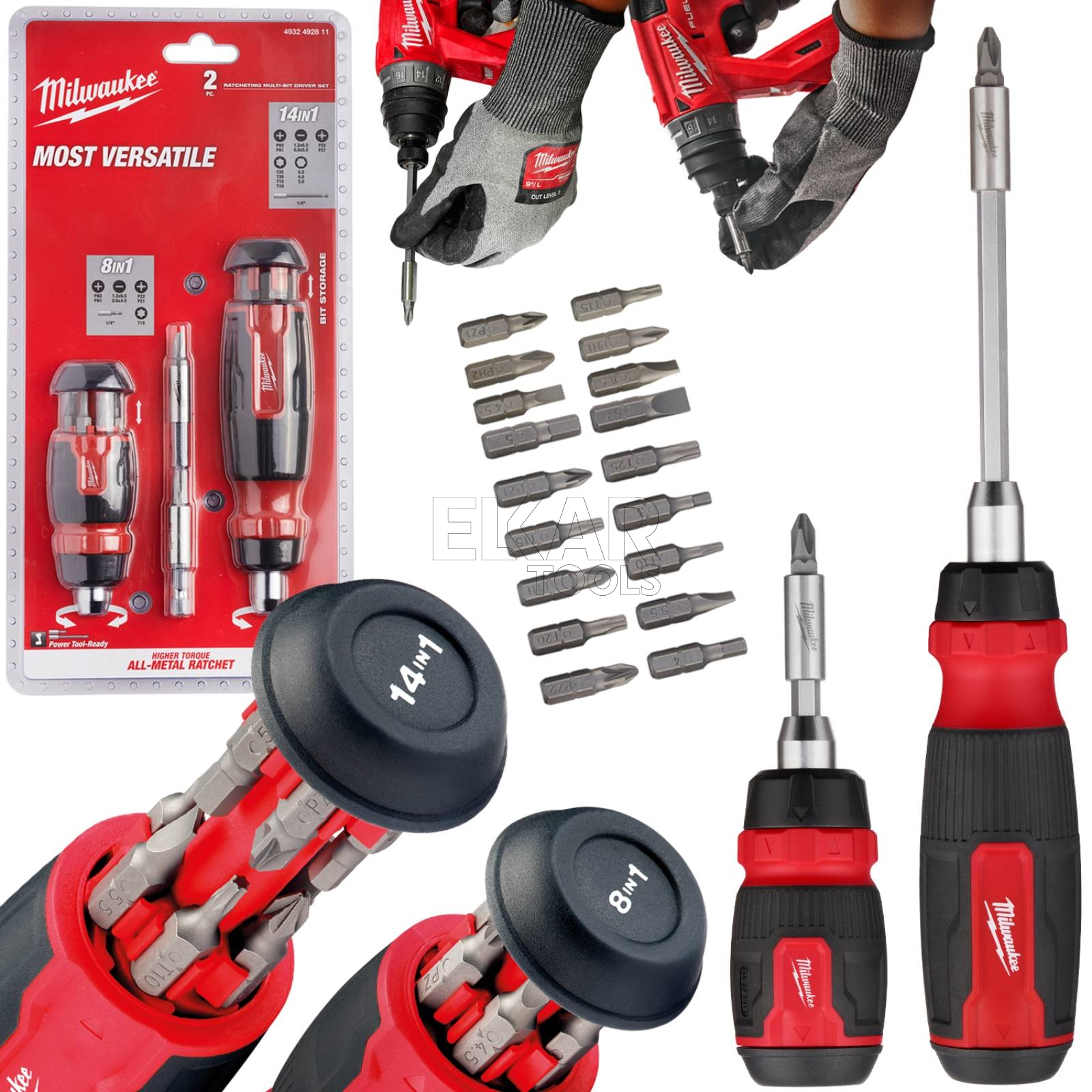 Zestaw 2 wkrętaków z grzechotką Milwaukee 8w1/14w1 + bity 4932492811