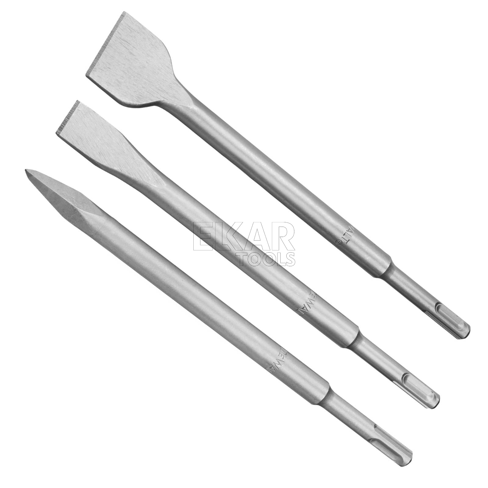 - Wszechstronność zastosowania – zestaw zawiera trzy różne typy dłut (szpicak, płaskie i szerokie), idealne do kucia, skuwania i usuwania płytek w różnych materiałach budowlanych.