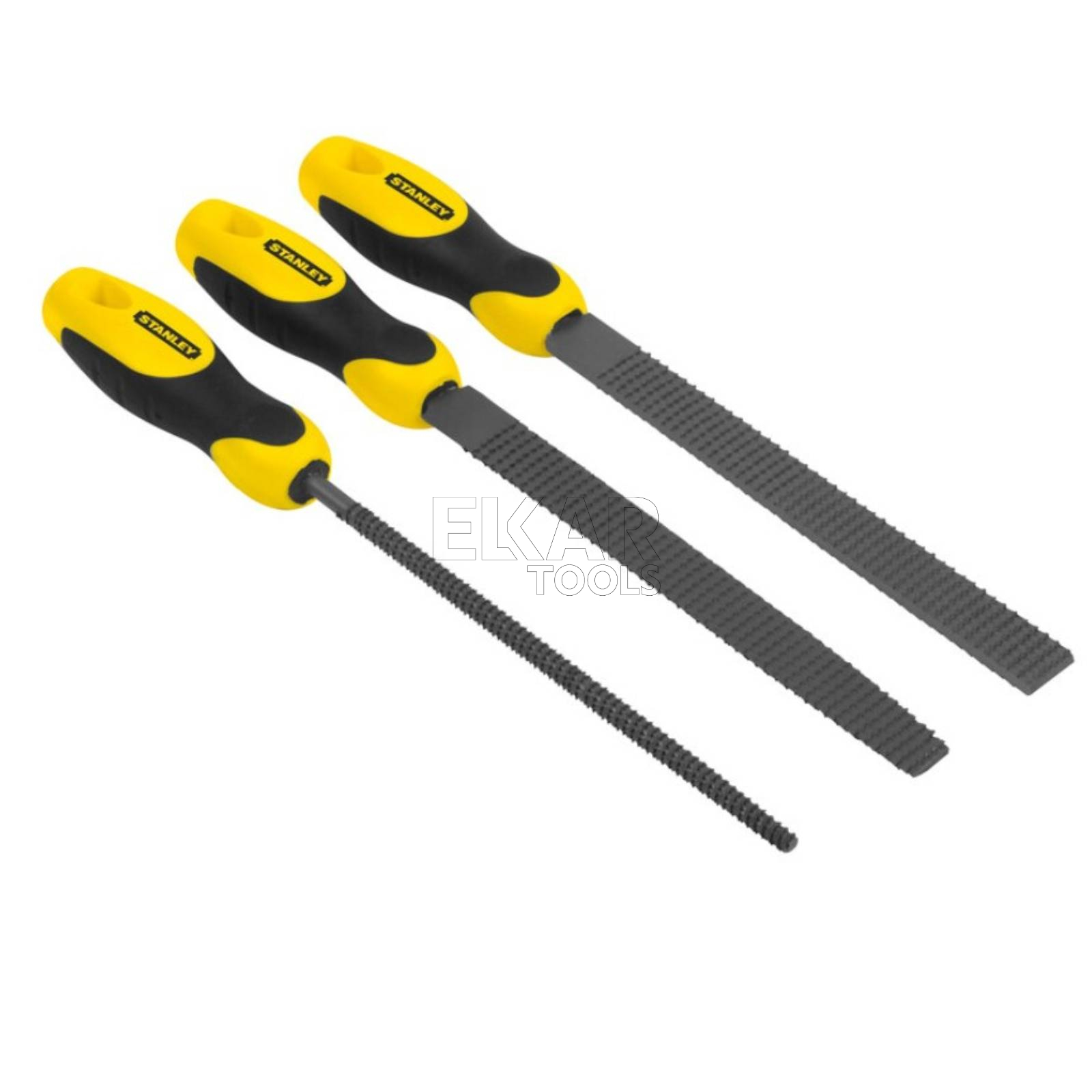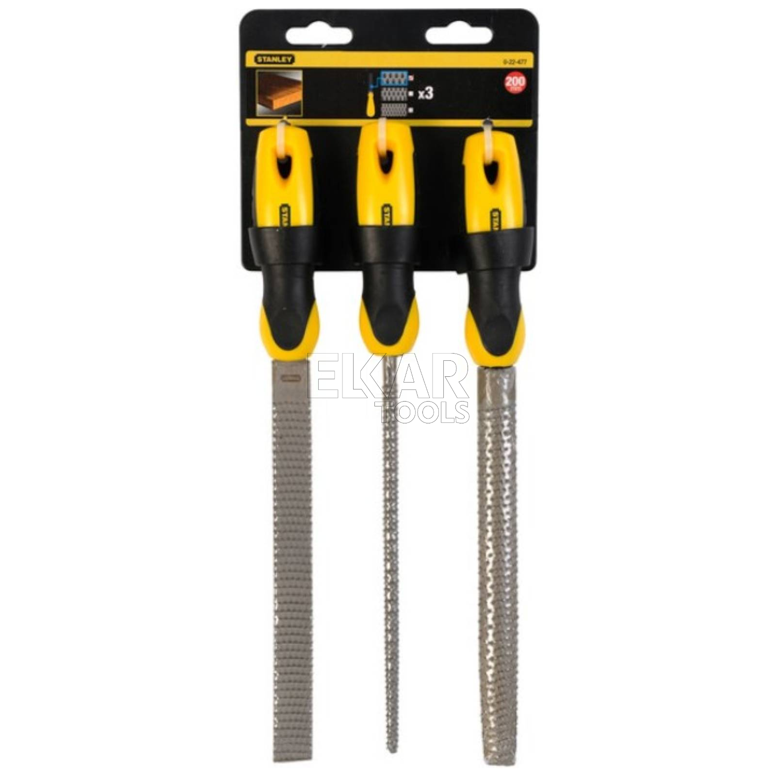 Zestaw 3 tarników do drewna 200 mm STANLEY 0-22-477 to niezawodne narzędzia ręczne przeznaczone do szybkiej i efektywnej obróbki drewna, tworzyw sztucznych oraz materiałów miękkich. W skład zestawu wchodzą trzy tarniki o różnych profilach: płaski, półokrągły i okrągły, co zapewnia wszechstronność i umożliwia precyzyjne dopasowanie narzędzia do kształtu obrabianej powierzchni. Każdy tarnik ma długość 200 mm i został wykonany z wytrzymałej stali, odpornej na ścieranie i uszkodzenia. Duże, ostre zęby skutecznie usuwają materiał, pozwalając na szybkie formowanie i wygładzanie powierzchni.