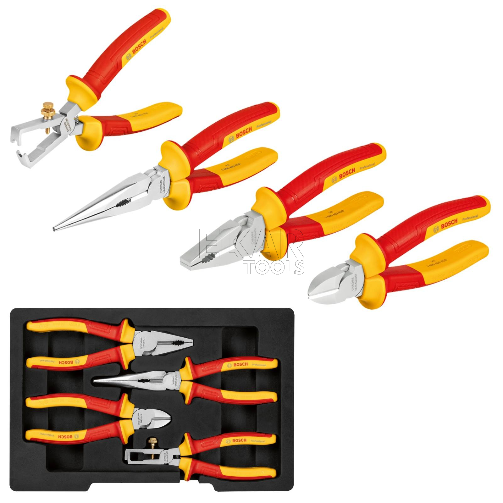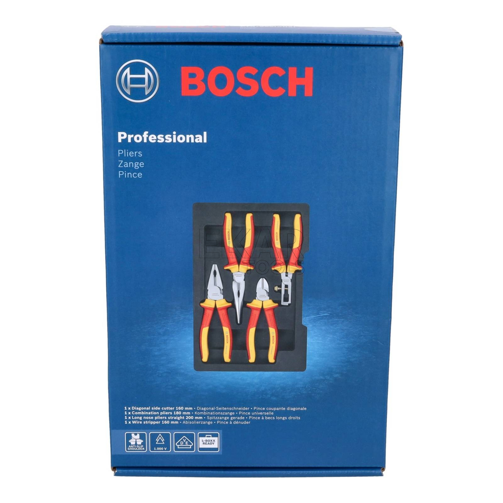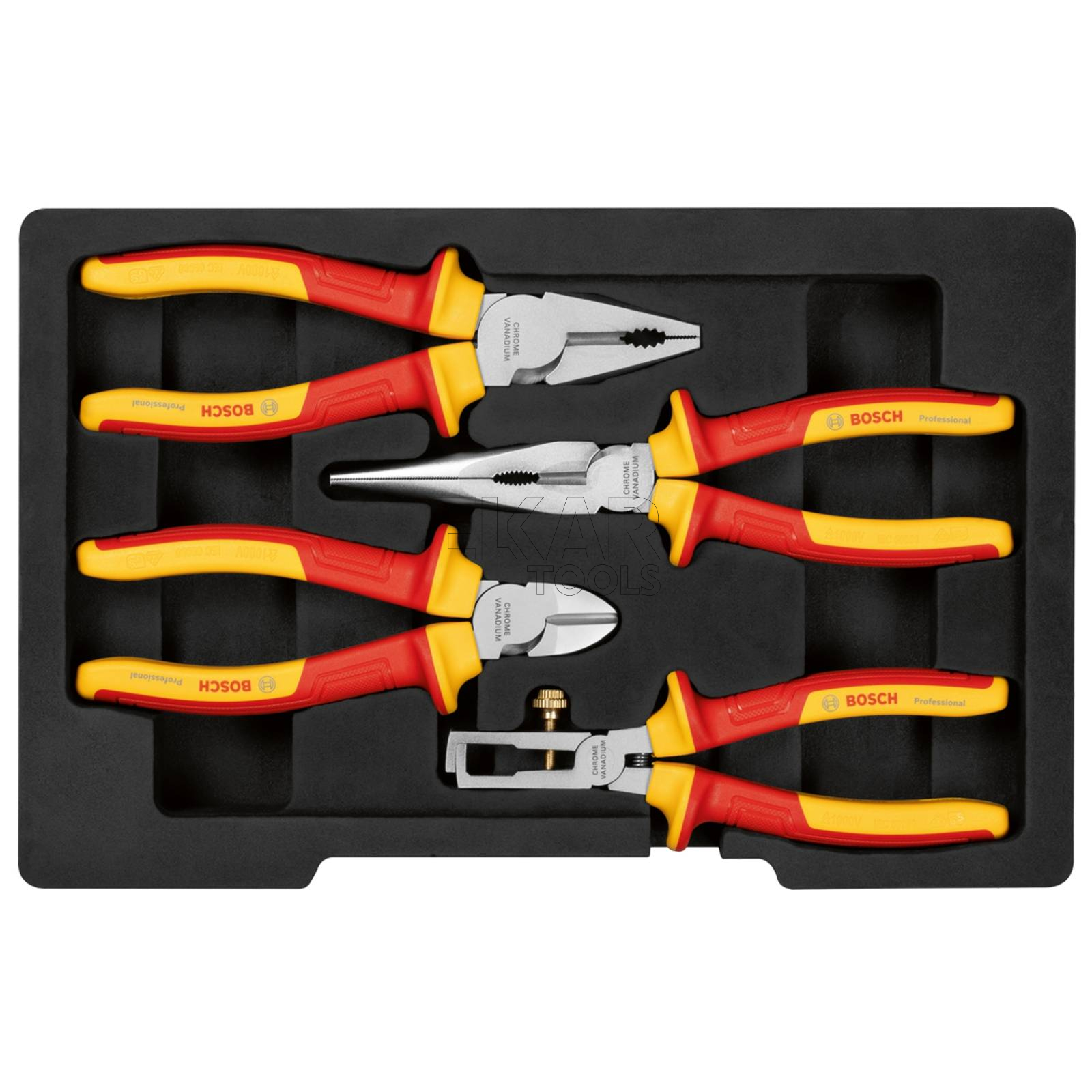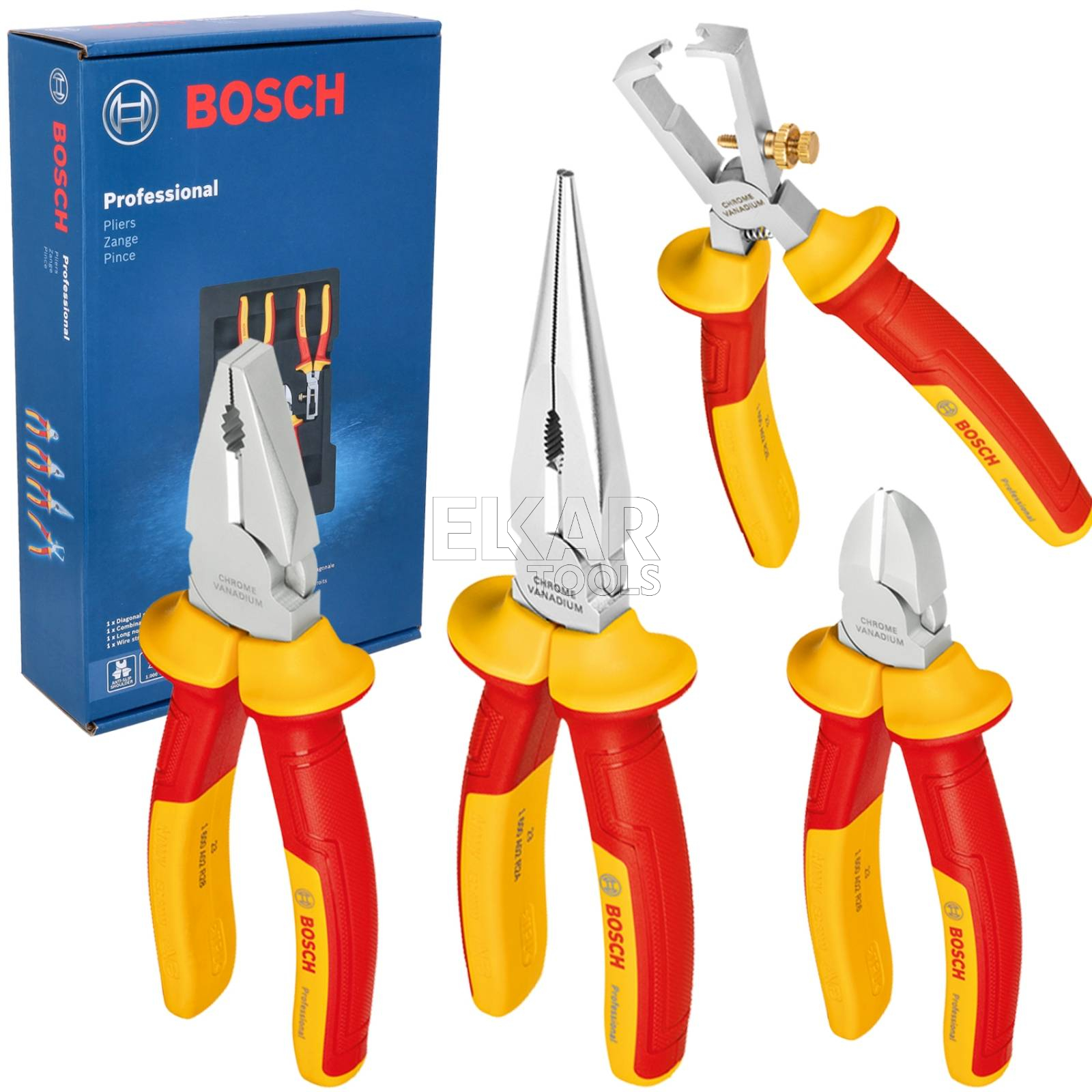 Zestaw 4 szczypiec VDE (uniwersalne, długie, boczne, do ściągania izolacji) BOSCH 1600A02NG1