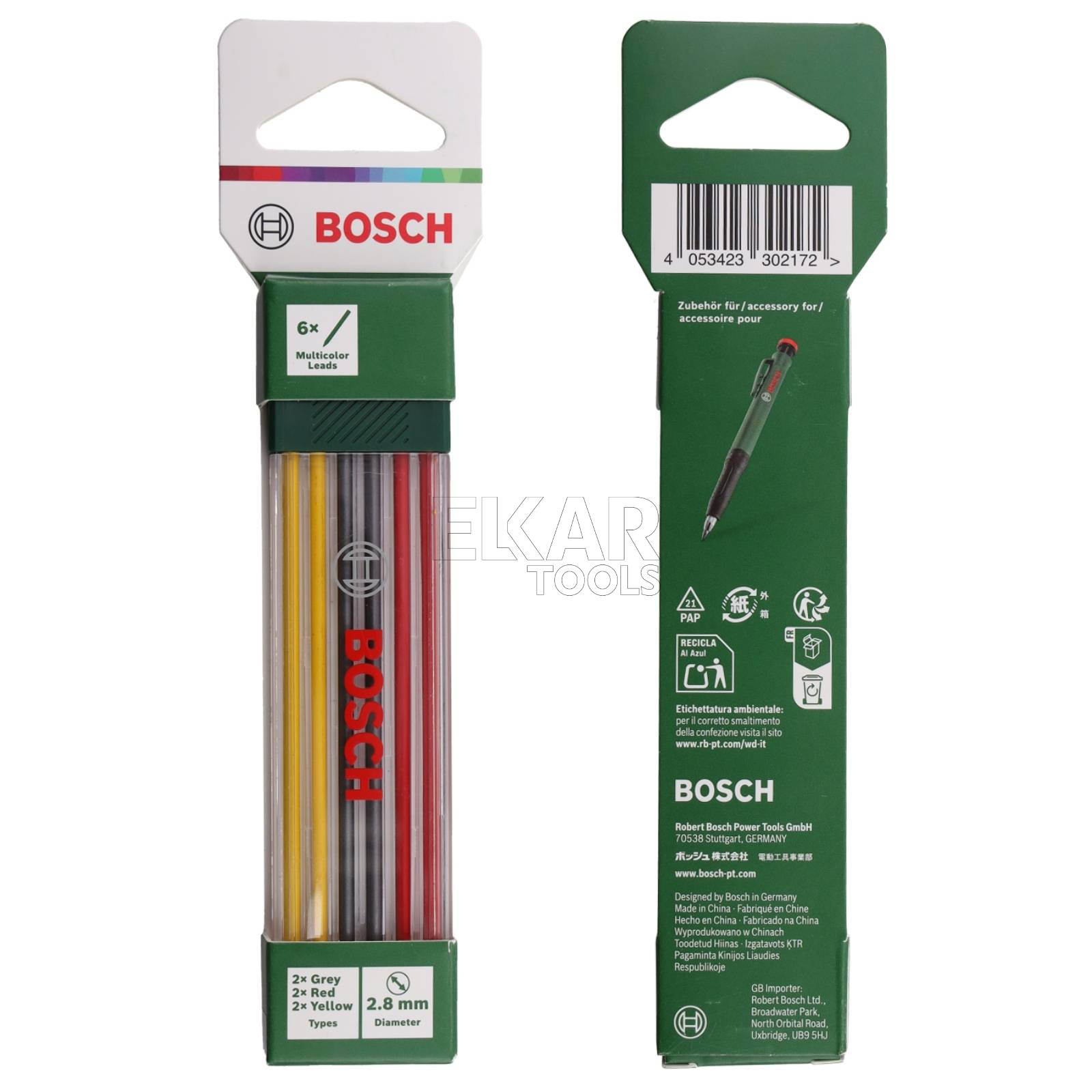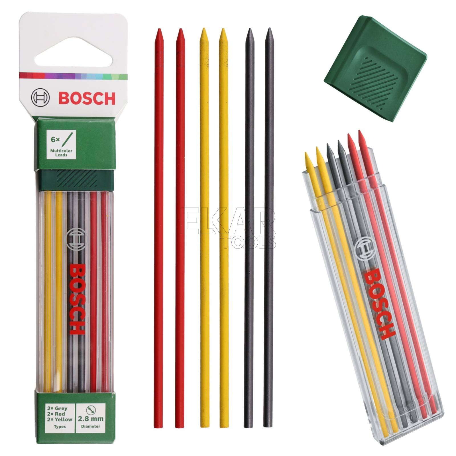 Wkłady kolorowe Bosch są doskonałym wyborem do precyzyjnego i czystego znakowania przy użyciu znacznika do głębokich otworów. Wytrzymałe wkłady o średnicy 2,8 mm są idealne do znakowania różnego rodzaju materiałów, m.in. kamienia, betonu, cegły, drewna i papieru. Znakowanie różnych materiałów i rozróżnianie oznaczeń, także na ciemnych powierzchniach, dzięki trzem różnym rodzajom wkładów – czerwony, żółty i grafitowy HB. 6 wkładów kolorowych jest dostarczanych w praktycznej kasecie umożliwiającej ich transport i przechowywanie.