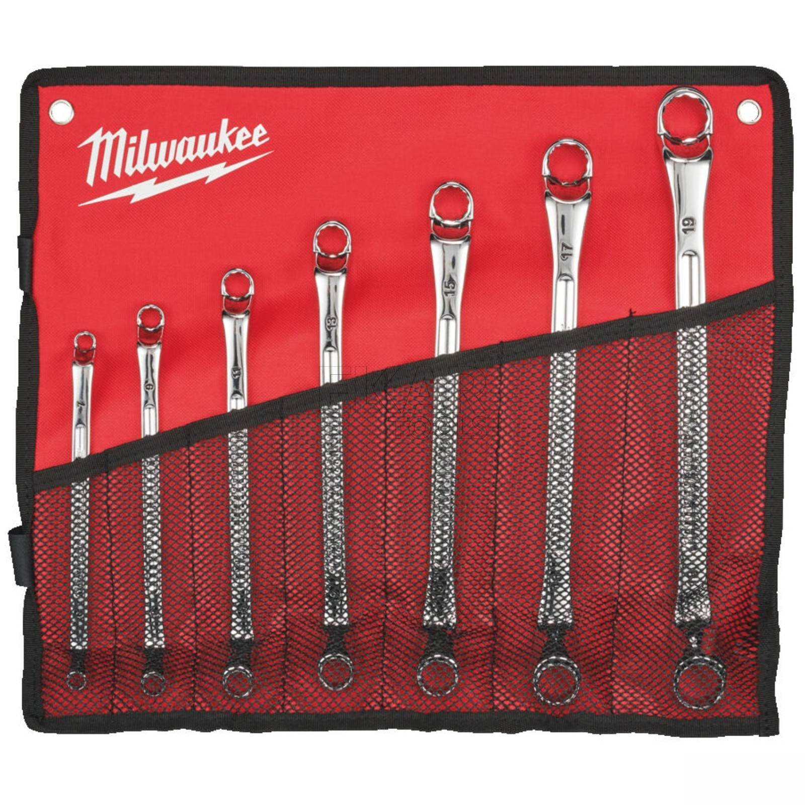 Zestaw 7 kluczy oczkowych podwójnie odsadzonych 75° Milwaukee 4932492737 to profesjonalny komplet narzędzi przeznaczony do intensywnych prac warsztatowych i serwisowych. Klucze zostały wykonane z wytrzymałej stali chromowo-wanadowej, co zapewnia im doskonałą trwałość, odporność na korozję oraz niezawodność nawet przy dużych obciążeniach. Ich specjalnie wyprofilowane, podwójnie odsadzone główki nachylone pod kątem 75° ułatwiają dostęp do trudno dostępnych śrub i nakrętek, zwłaszcza w ciasnych przestrzeniach.