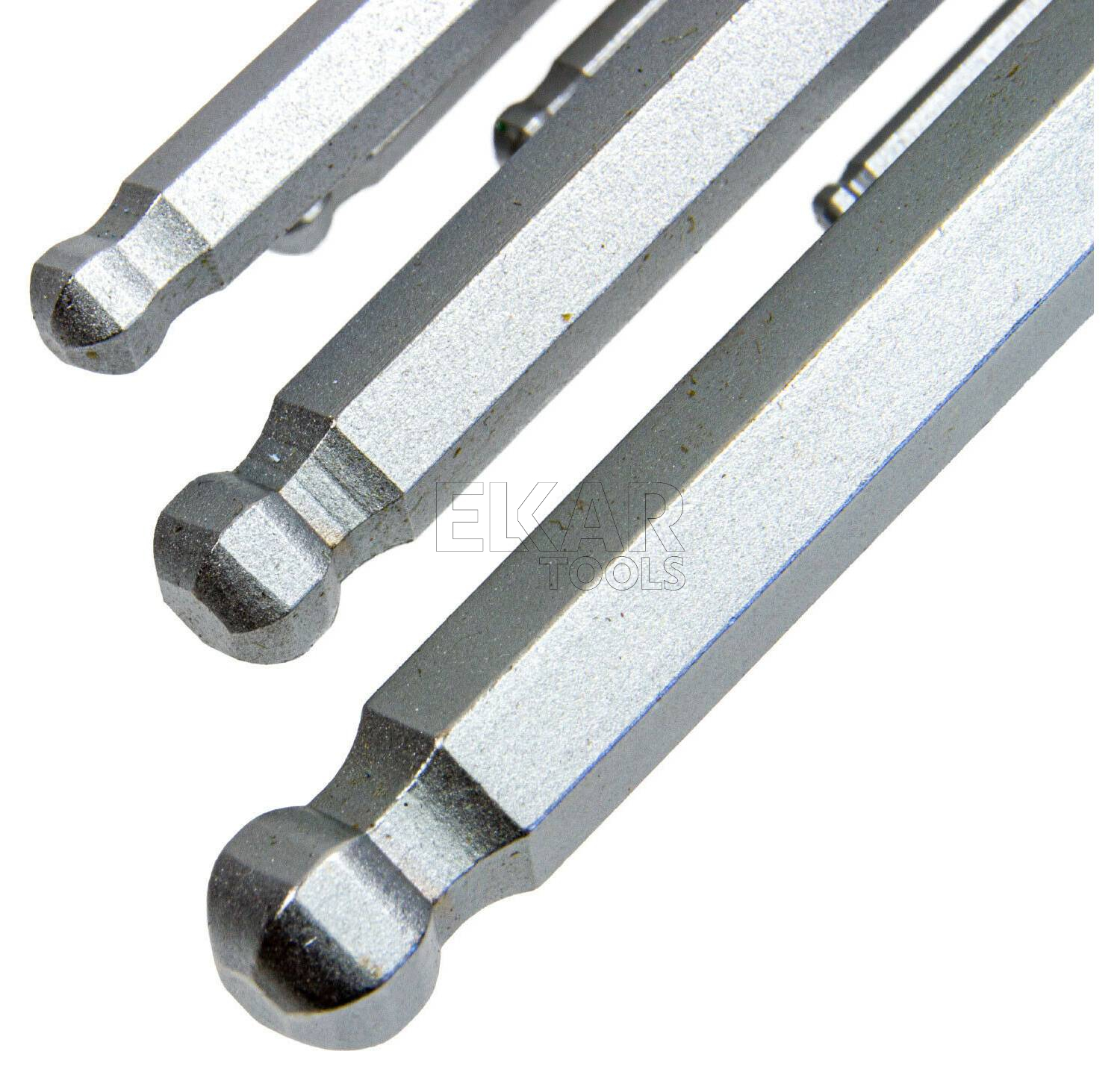Konstrukcja grotu wykonanego z hartowanej stali S2 nie powoduje jego wyrabiania się i zapewnia optymalny moment obrotowy przez długi czas. Kuliste główki zapewniają wygodną pracę w miejscach trudno dostępnych. Komfortowa długość kluczy sześciokątnych umożliwia zwiększenie momentu obrotowego i wygodne wkręcanie i odkręcanie wkrętów o profilu sześciokątnym. Zestaw zawiera 9 kluczy sześciokątnych w rozmiarach: 1,5, 2, 2,5, 3, 4, 5, 6, 8 i 10 mm.