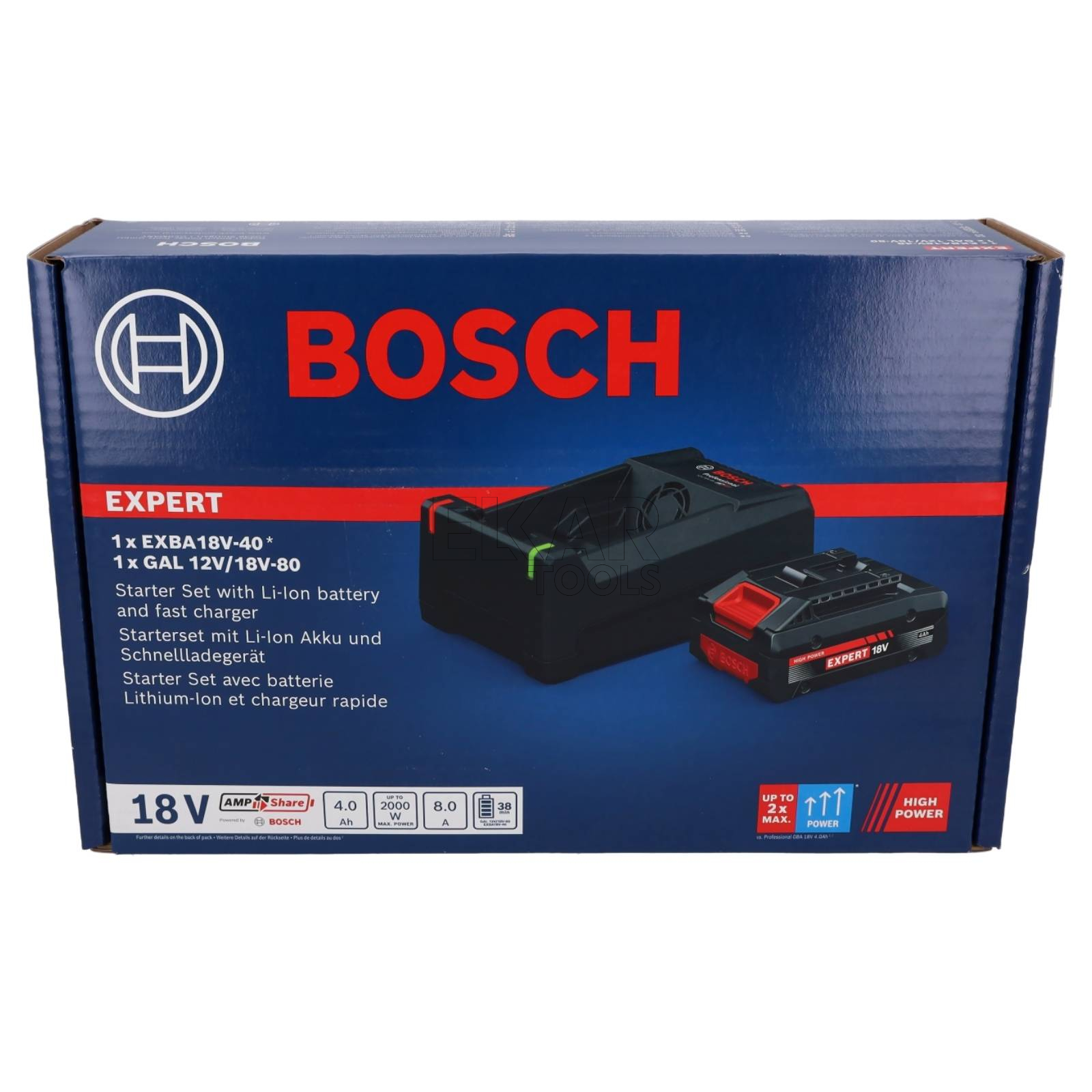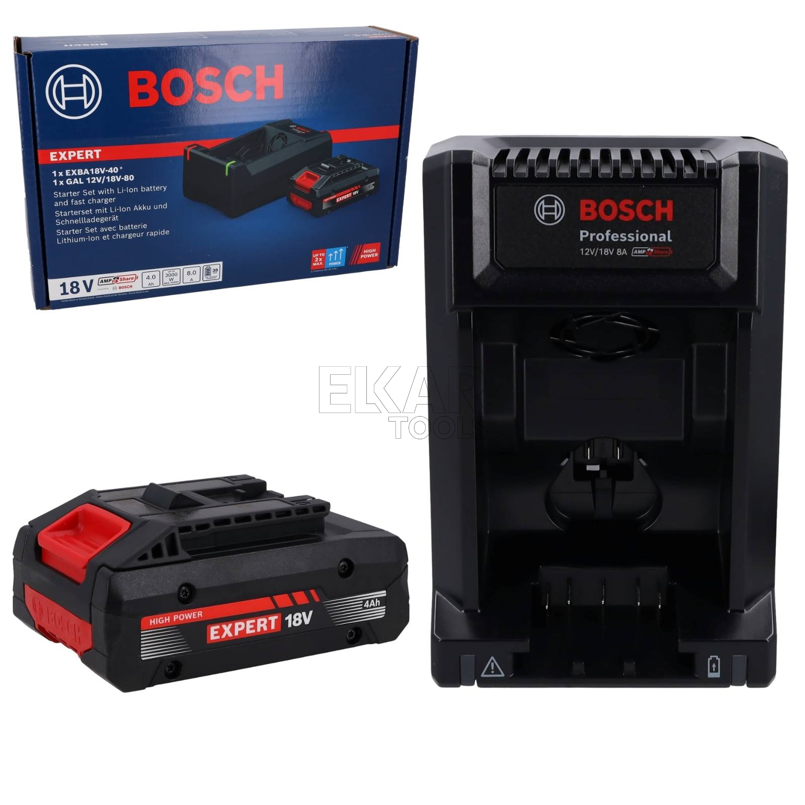 Akumulator EXBA18V-40 i ładowarka GAL 12V/18V-80 są kompatybilne z Bosch Professional 18V System oraz z systemem akumulatorowym AMPShare dla wielu marek. Ładowarka GAL 12V/18V-80 jest także kompatybilna z Bosch Professional 12V System. Akumulator EXBA18V-40 waży tylko 605 g. Ładowarkę GAL 12V/18V-80 można w łatwy sposób zamontować na ścianie, a dwa wskaźniki LED informują o statusie naładowania.