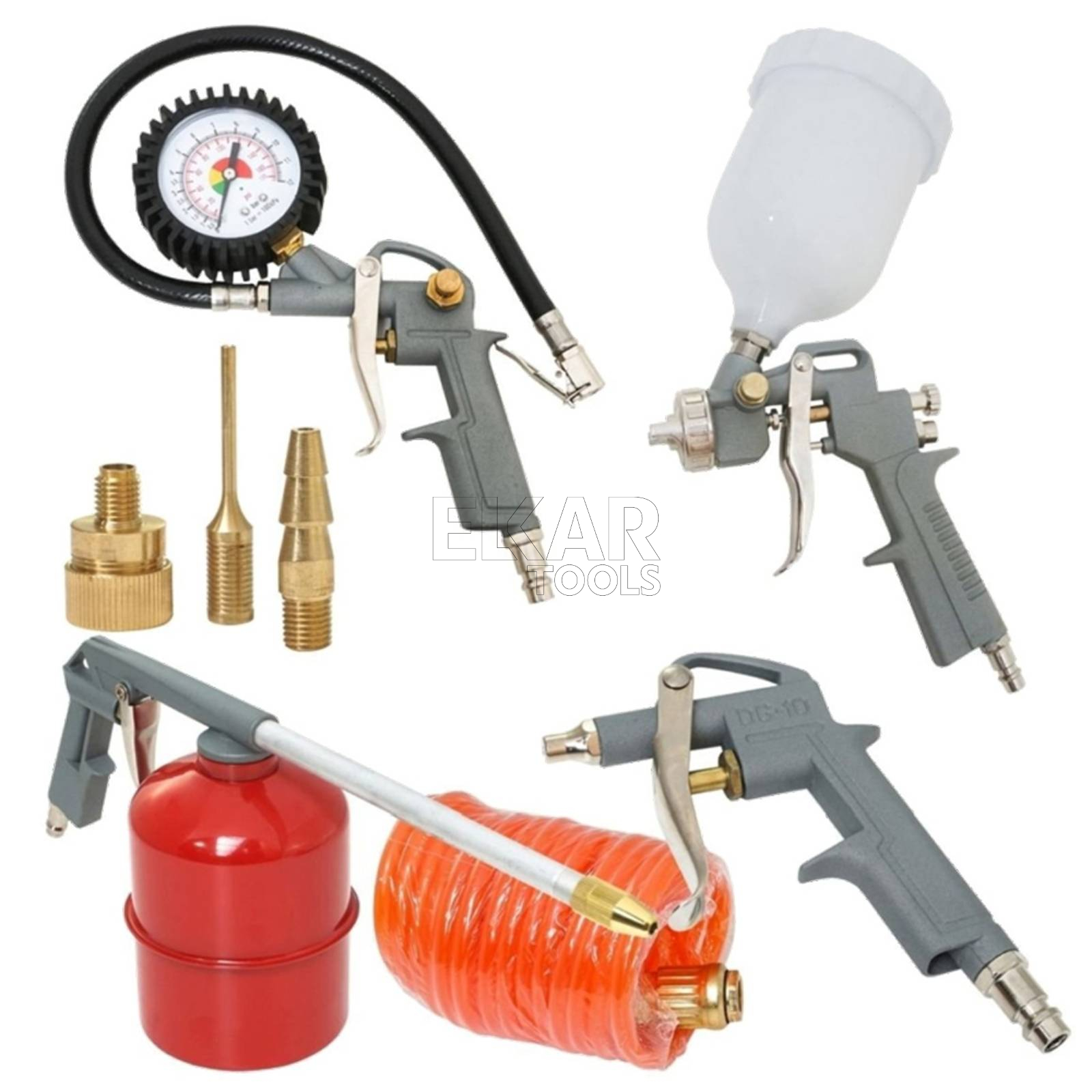 Zestaw końcówek pneumatycznych: Zawiera różnorodne końcówki, które zwiększają funkcjonalność narzędzi, umożliwiając ich zastosowanie w wielu różnych zadaniach.