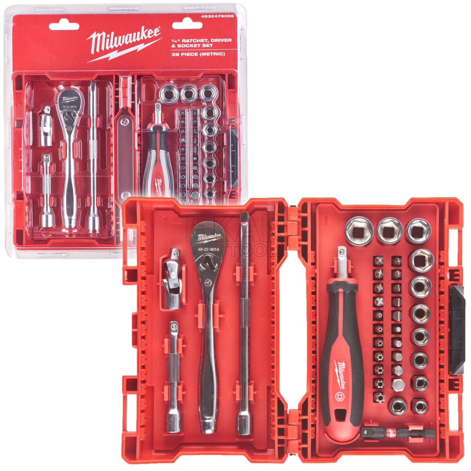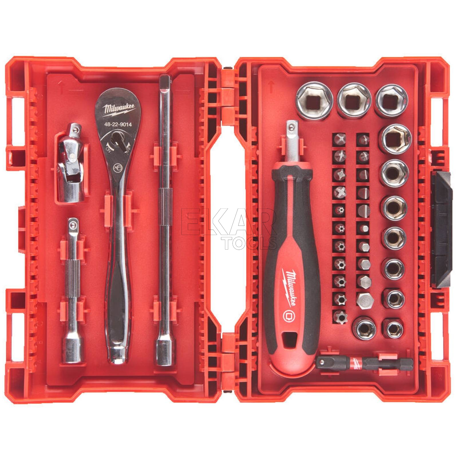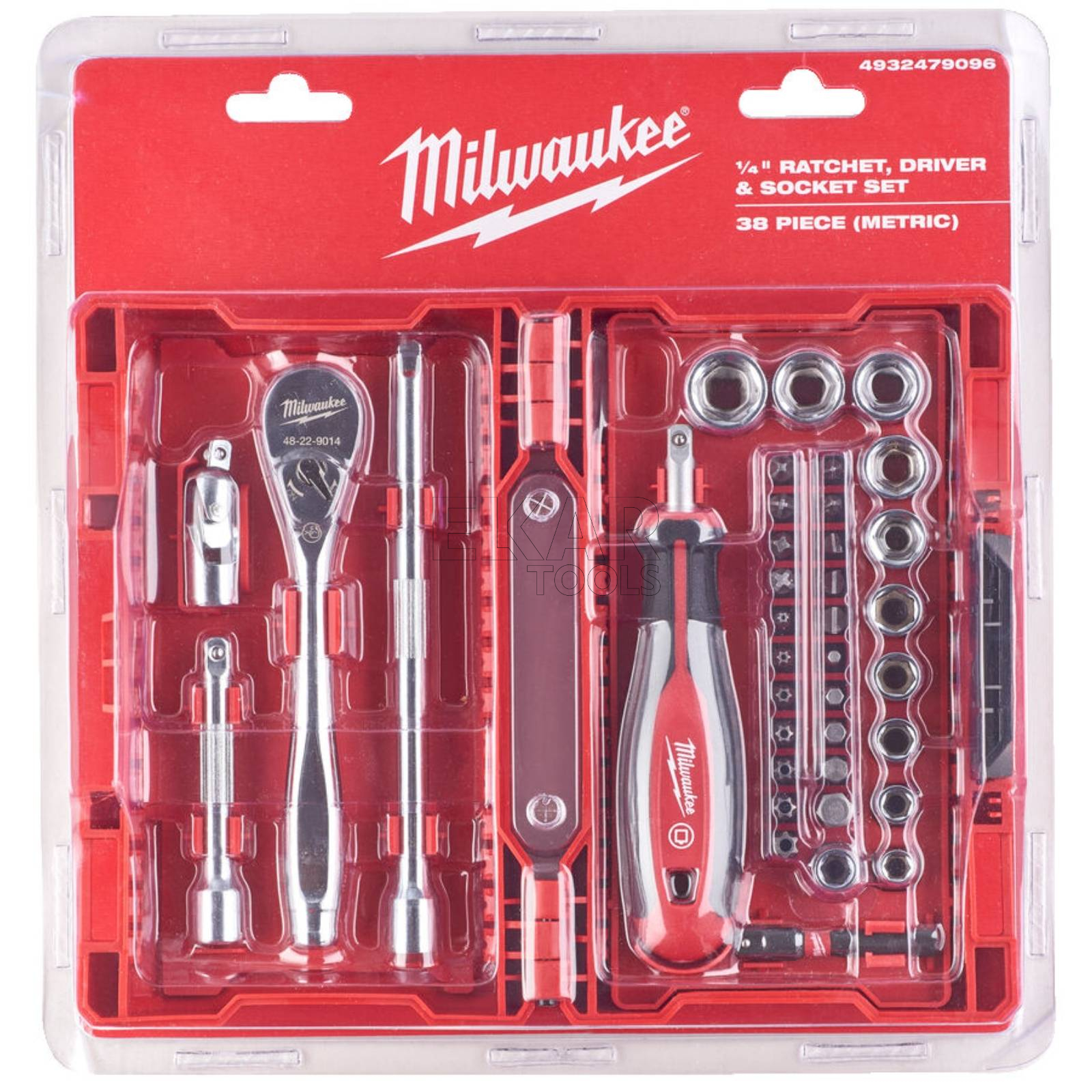 Zestaw nasadek 1/4" z grzechotką i wkrętakiem Milwaukee 4932479096 to 38-elementowy komplet narzędzi, idealny dla profesjonalistów i majsterkowiczów. Grzechotka o 90-zębowej konstrukcji zapewnia minimalny kąt obrotu wynoszący 4°, umożliwiając pracę w ciasnych przestrzeniach. Nasadki wyposażone w technologię FOUR FLAT™ zapobiegają toczeniu się, a wyraźne oznaczenia rozmiarów na płaskich powierzchniach ułatwiają identyfikację.