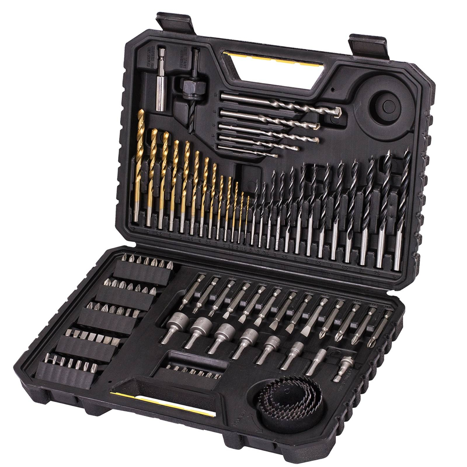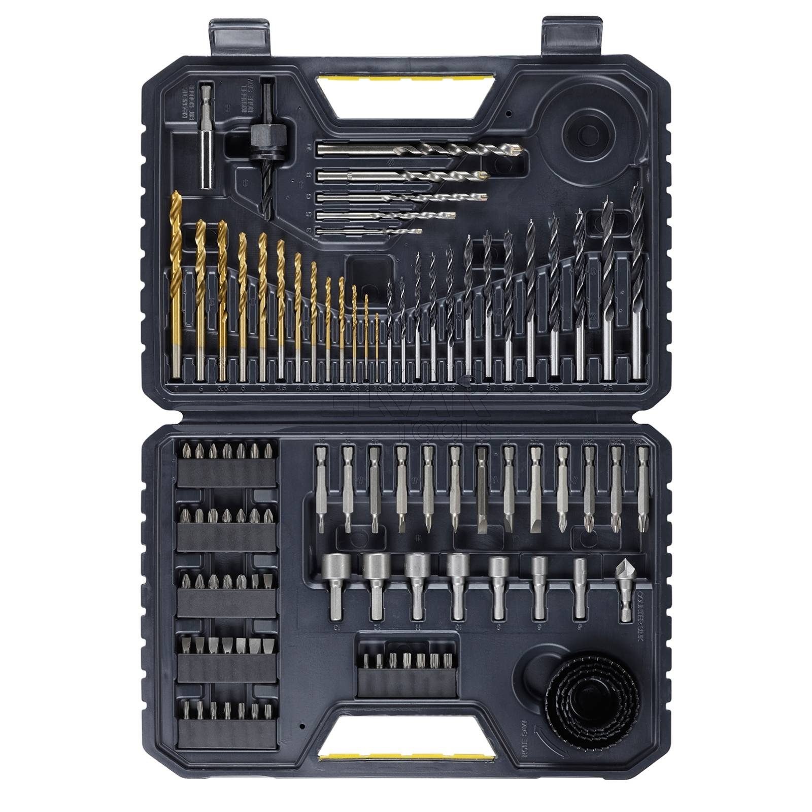 Kompleksowy zestaw do różnych zadań – zawiera wiertła do metalu, drewna i betonu oraz szeroki wybór bitów i akcesoriów, idealny do prac montażowych, remontowych i serwisowych.