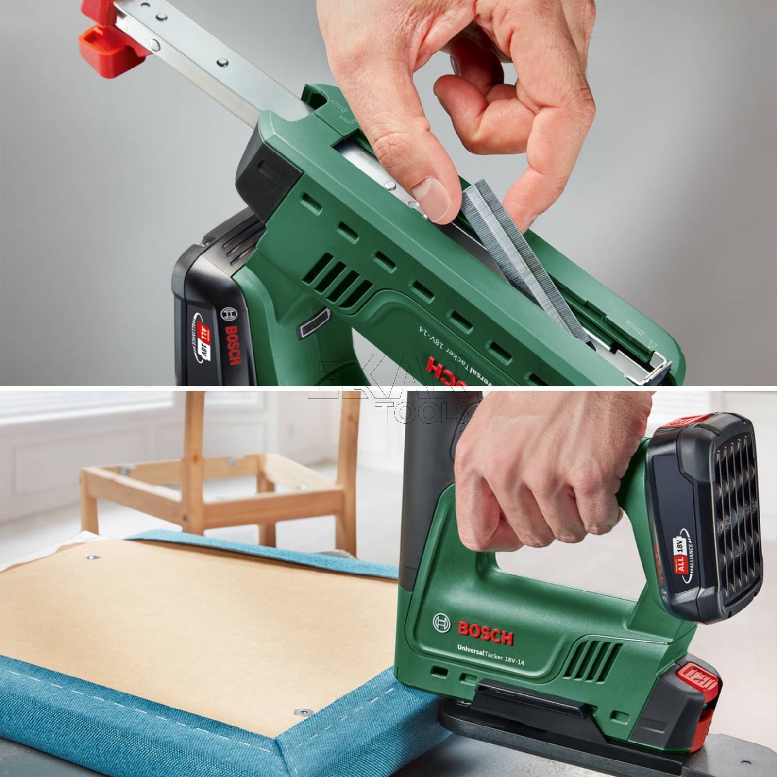 Model UniversalTacker 18V-14 to akumulatorowe narzędzie do zszywania i wbijania gwoździ zapewniające nowy poziom komfortu i wszechstronności podczas majsterkowania i wykonywania prac zawiązanych z mocowaniem. Zaprojektowany pod kątem łatwego osadzania zszywek i gwoździ, ergonomiczny zszywacz z dużą wydajnością wbija zszywki i gwoździe w miękkim i twardym drewnie. Podczas pracy z różnymi materiałami i różnymi długościami zszywek można wyregulować skok w celu zapewnienia optymalnej siły poprzez obrócenie pokrętła wyboru siły udaru. System Push+Release zapewnia optymalną kontrolę podczas pracy poprzez wyeliminowanie ryzyka przypadkowego wyzwolenia strzału.